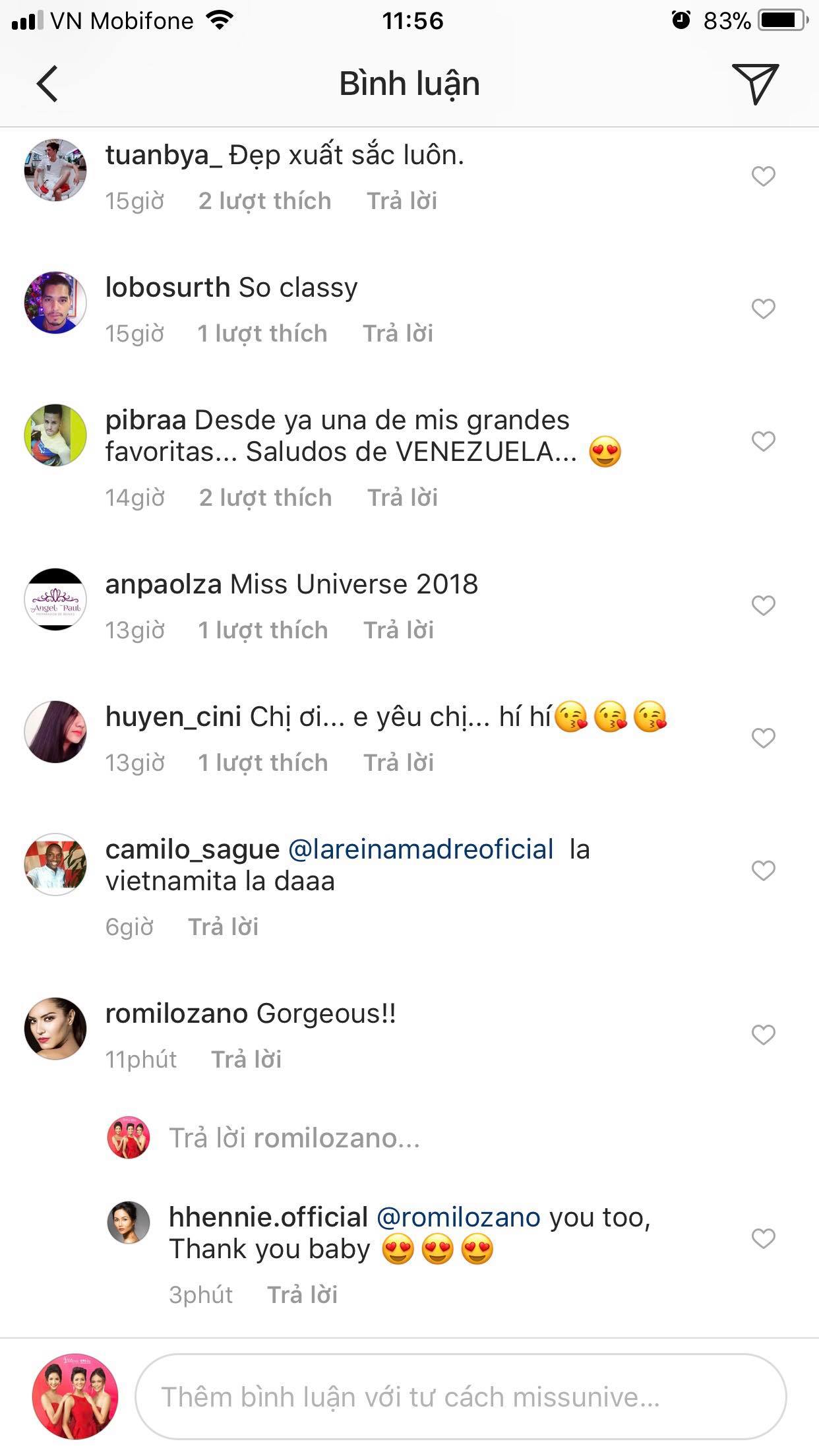 Các người đẹp đến từ Peru, Indonesia, Malaysia hay Venezuela thường xuyên bấm thích và để lại bình luận phía dưới hình ảnh của tân Hoa hậu Hoàn vũ Việt Nam. Đây là dấu hiệu đáng mừng khi các đối thủ bắt đầu quan tâm và “dè chừng” đại diện Việt Nam tại Miss Universe năm nay.