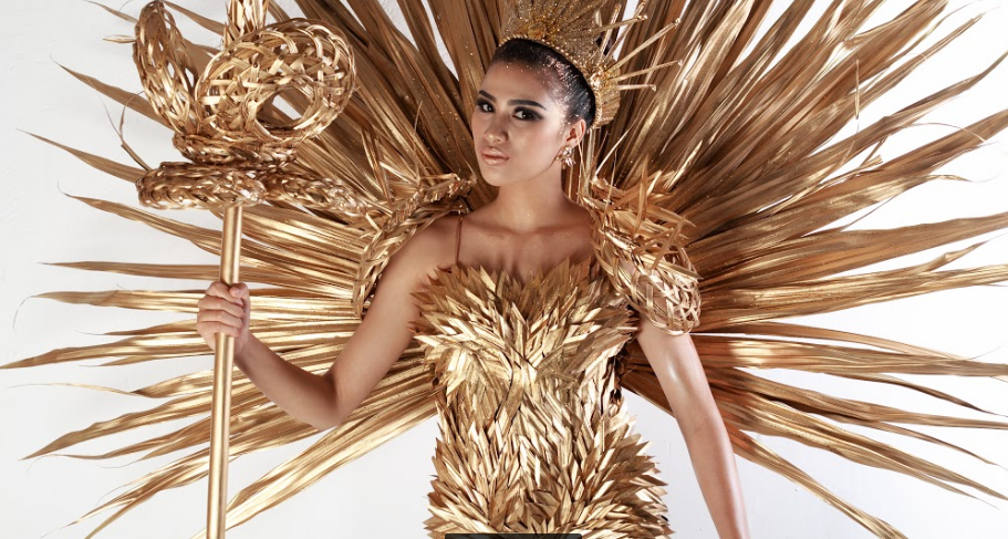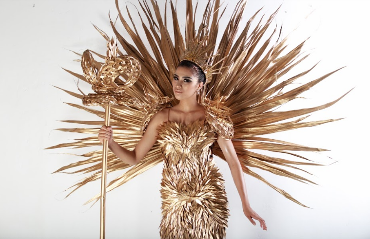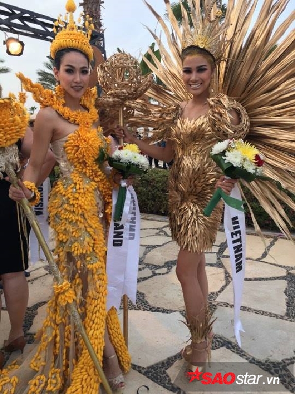 Về phần Nguyễn Thị Thành, cô mang tới bộ trang phục làm hoàn toàn bằng nguyên liệu tự nhiên, đó là lá cây dừa của vùng Bến Tre - Việt Nam và được sơn vàng rất bắt mắt.