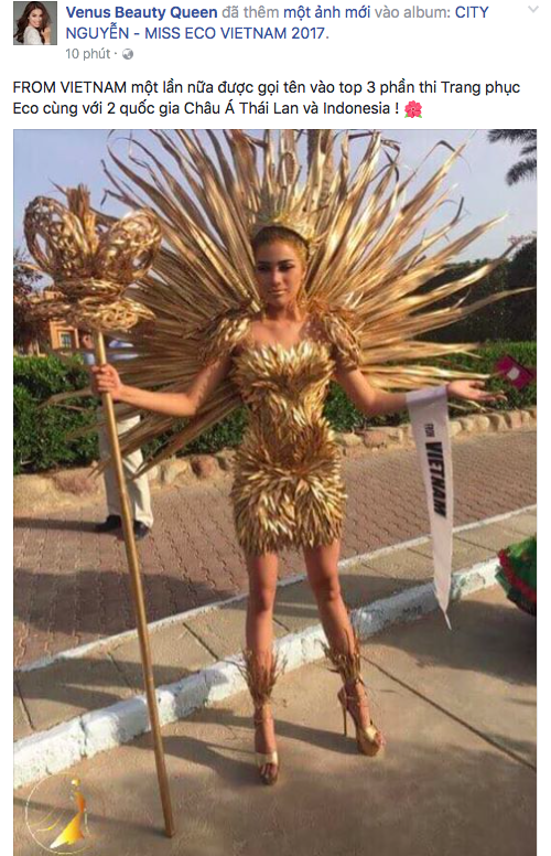 Thông tin người đẹp lọt Top 3 phần thi Eco Costume cũng được chia sẻ trên một Fanpage uy tín ngay sau đó.