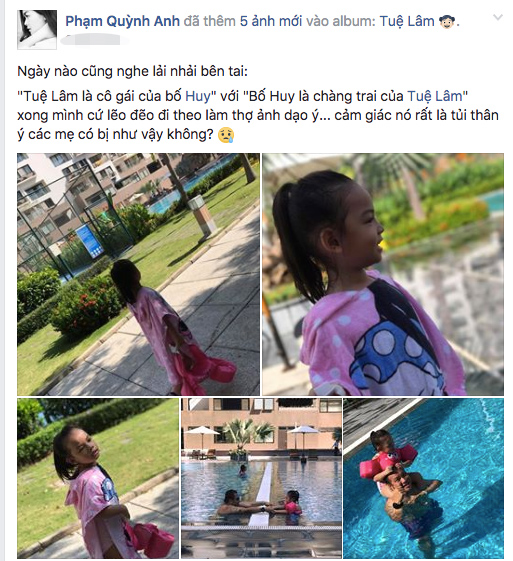“Ngày nào cũng nghe lải nhải bên tai: “Tuệ Lâm là cô gái của bố Huy” với “Bố Huy là chàng trai của Tuệ Lâm”, xong mình cứ lẽo đẽo đi theo làm thợ ảnh dạo ý… Cảm giác nó rất là tủi thân ý các mẹ có bị như vậy không?” - Phạm Quỳnh Anh viết.