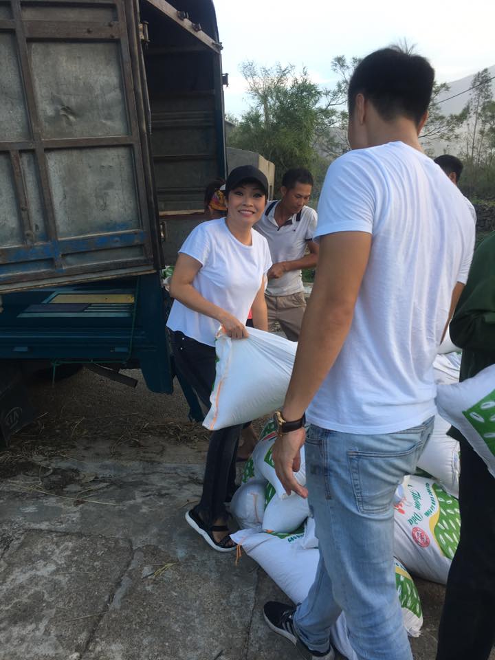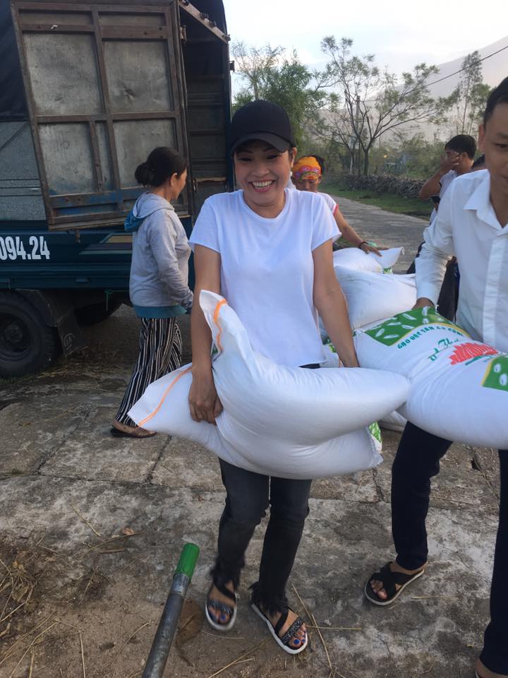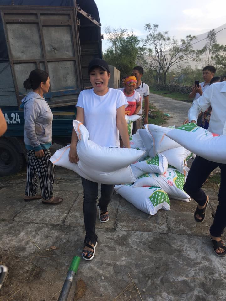 Phương Thanh vui vẻ mang từng bao gạo đến tặng người dân gặp hoàn cảnh khó khăn.