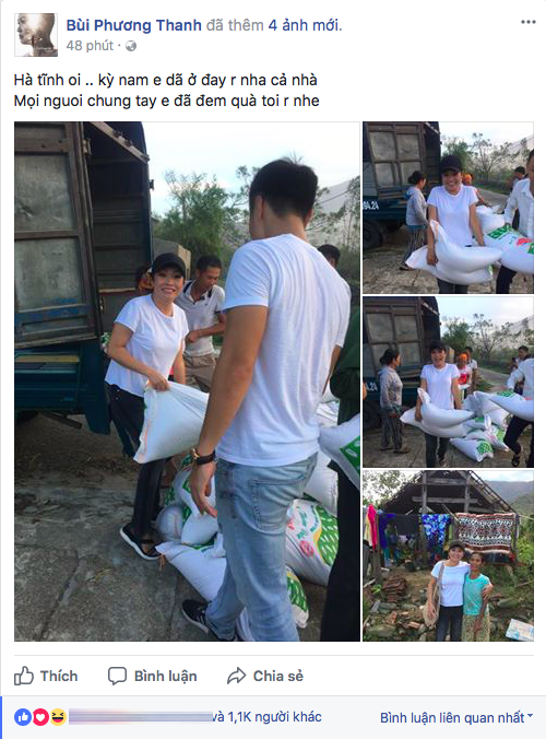 Mới đây, nữ ca sĩ Phương Thanh chia sẻ một số hình ảnh cô cùng vài người bạn đang có chuyến đi từ thiện, giúp đỡ đồng bào Hà Tĩnh sau thiệt hại của cơn bão số 10 vừa qua. Hình ảnh giọng ca Trống vắng tươi cười rạng rỡ, hăng say vác từng bao gạo khiến không ít khán giả nể phục.