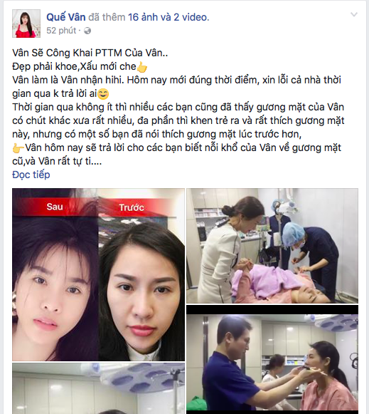Mới đây, trên Facebook cá nhân, nữ ca sĩ đã công khai toàn bộ hình ảnh quá trình “đập mặt đi làm lại” với mọi người. Theo Quế Vân nếu đẹp phải khoe, xấu mới che và một khi dám thẩm mỹ thì dám nhận.