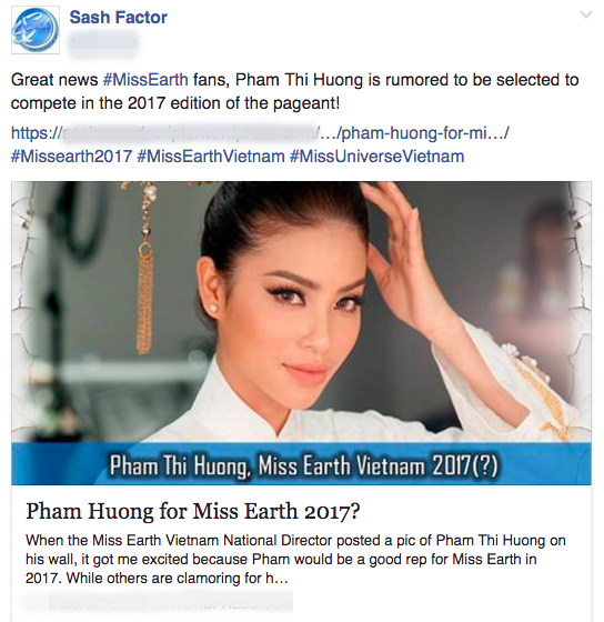 Trên trang facebook chính thức của Sash Factor - một website sắc đẹp quốc tế uy tín bất ngờ đăng tải một bài viết ủng hộ Phạm Hương đi thi Hoa hậu Trái đất 2017. Dù khẳng định đây là thông tin chưa chính thức nhưng chia sẻ của Sash Factor đã lập tức tạo nên một làn sóng trong cộng đồng người hâm mộ.