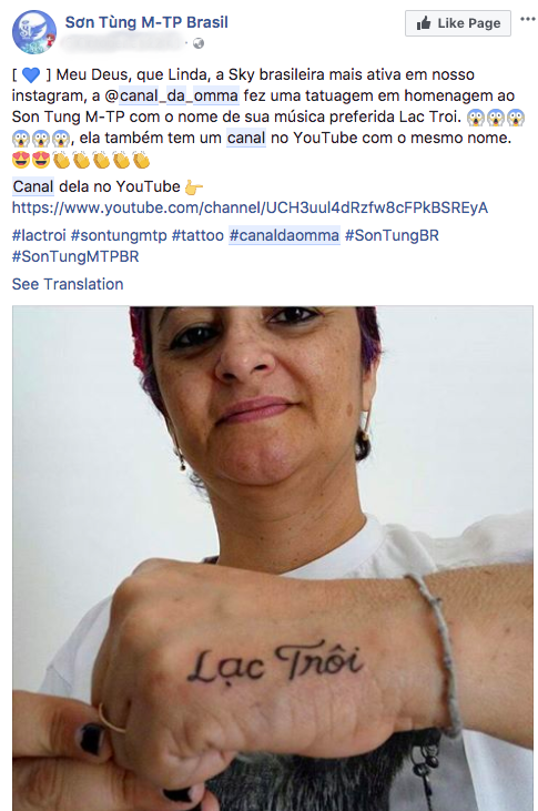 Mới đây, fanpage của Sơn Tùng M-TP tại Brazil bất ngờ đăng tải hình ảnh một người hâm mộ lớn tuổi, trên tay là hình xăm có chữ “Lạc trôi” nổi bật. Fanpage này cũng cho biết thêm, người xăm hình là bà cụ có tài khoản Instagram tên @canal_da_omma - một trong những fan tích cực nhất của cộng đồng Sky Brazil.