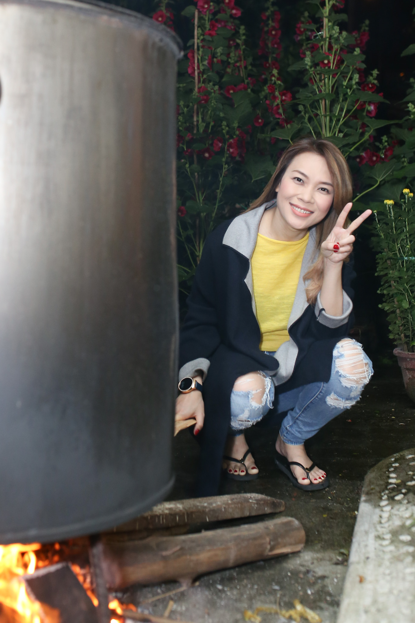 Dù trời đổ mưa và khá lạnh nhưng Mỹ Tâm vẫn miệt mài với nồi bánh tét.