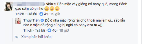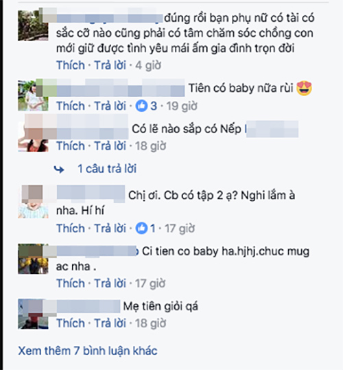 Nhìn chị Tiên mặc váy giống có baby quá, mong Bánh gạo sớm có em nhé!”, “Chị đang có em bé, thời gian này chị ít khi xuất hiện. Chắc đang dưỡng thai rồi…”, hay “Chúc mừng chị nhé! Mong là bé Thóc nè, cả trai và gái sau này huyền thoại giống ba Vinh nè“.