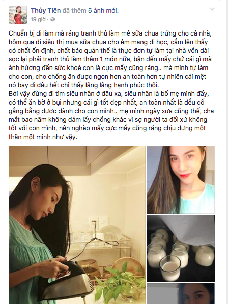Mới đây, trên trang Facebook cá nhân của mình, Thủy Tiên chia sẻ khoảnh khắc giản dị đang vào bếp làm món sữa chua cho chồng và con gái Bánh Gạo. Nữ ca sĩ không ngại khó khăn, vất vả, chỉ cần gia đình mình có những món ăn an toàn, sạch sẽ và sức khỏe tốt.