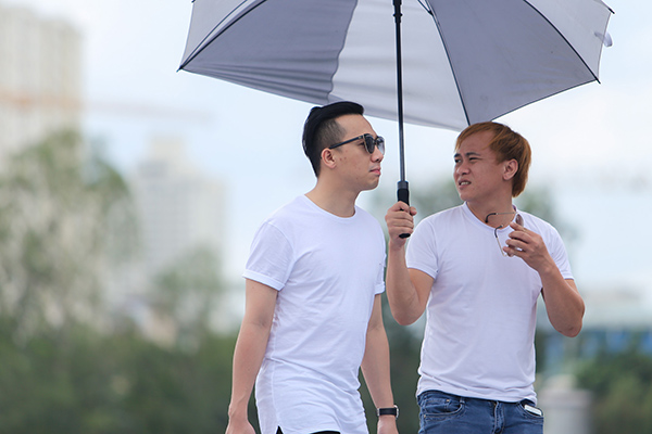 Ngay cả khi đứng trao đổi kịch bản với Khương Ngọc, Trấn Thành cũng có trợ lý đứng che ô khỏi nắng.