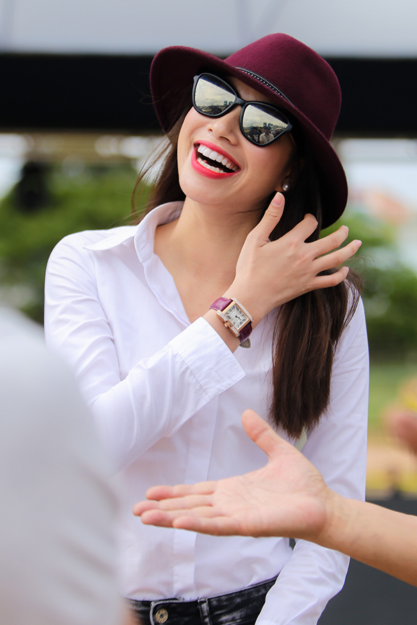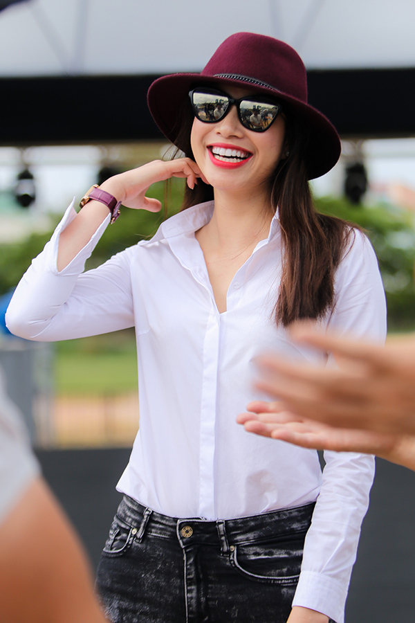 Hoa hậu Hoàn vũ Việt Nam Phạm Hương xuất hiện giản dị với áo sơ mi trắng, quần jeans. Cô luôn nở nụ cười rạng rỡ, thân thiện trước ống kính. Trong sự kiện, Phạm Hương sẽ giữ vị trí khách mời trao giải.