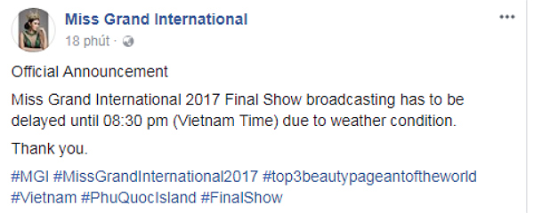 - BTC Miss Grand International 2017 thông báo hoãn giờ bắt đầu đêm Chung kết do mưa lớn