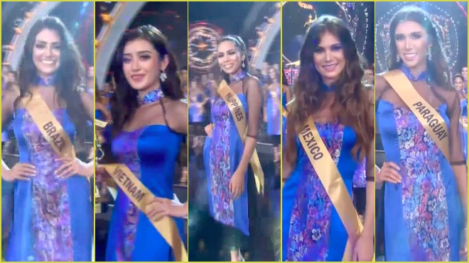 21h17: Dàn thí sinh trở lại trình diễn trang phục áo tắm. Đại diện Việt Nam Nguyễn Trần Huyền My gây chú ý với vị trí chính giữa sân khấu.