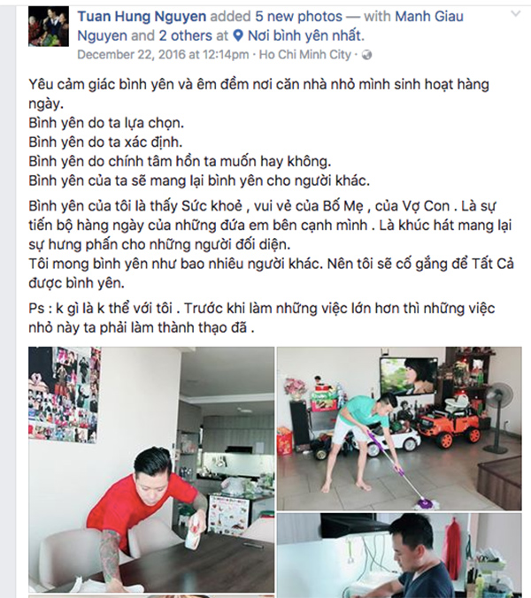 Trong cuộc sống của anh chỉ có 2 người phụ nữ là mẹ anh và em. Anh yêu em!” - Tuấn Hưng viết lời đường mật gửi đến bà xã Thu Hương.