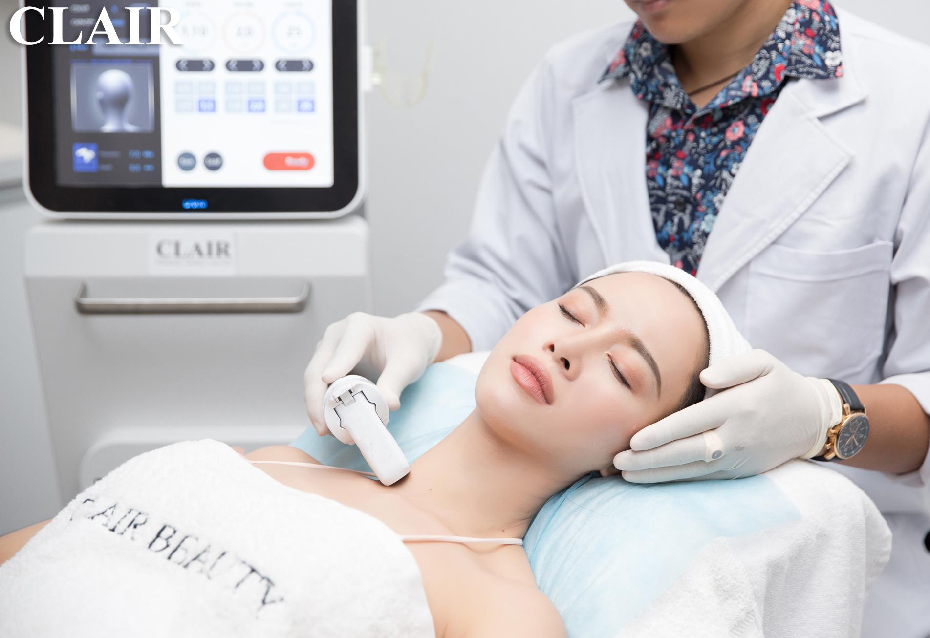 Ngọc Anh đang trải nghiệm một liệu pháp tại Clair. Loại máy được sử dụng trong hình có tên gọi HIFU, thường được dùng kết hợp với Thermage cho gương mặt thon gọn V-line hoàn hảo hơn.