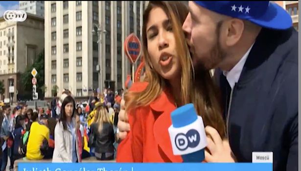 Mặc dù bị quấy rối ngay trên sóng truyền hình trực tiếp, nữ phóng viên vẫn giữ được bình tĩnh tường thuật không khí World Cup như chưa có chuyện gì xảy ra.