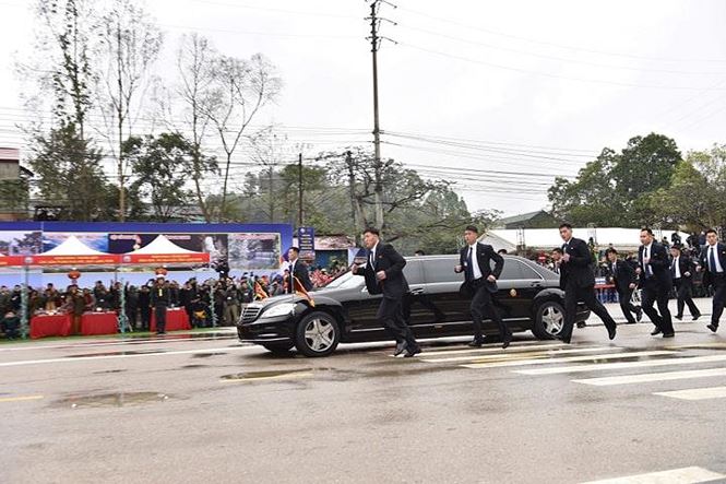 12 vệ sĩ chạy bộ quanh chiếc xe của ông Kim lúc xe bắt đầu lăn bánh hướng về Thủ đô Hà Nội. Ảnh: Nguyên Phúc/Tiền Phong