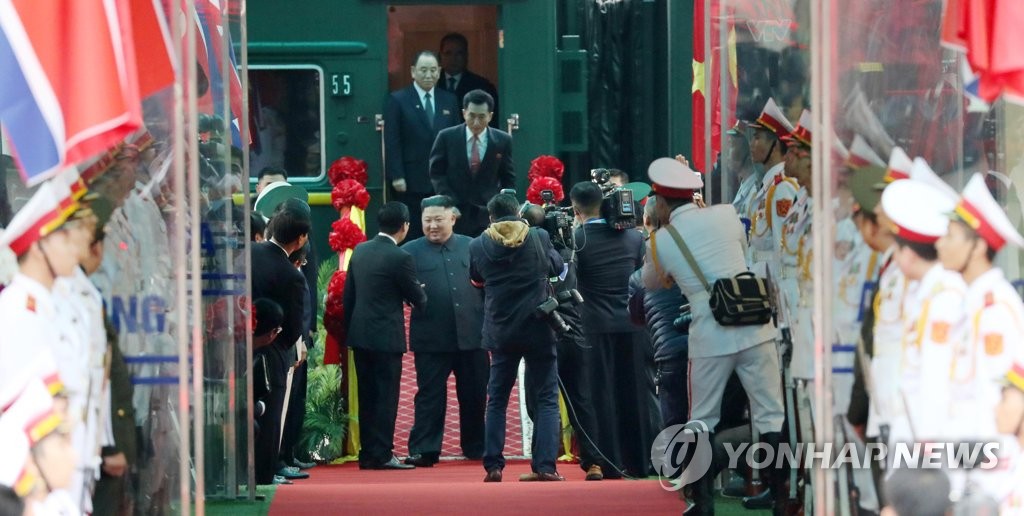 Khoảng 8h30, Chủ tịch Triều Tiên Kim Jong-un bước xuống ga Đồng Đăng thuộc tỉnh Lạng Sơn. Ông vẫy tay chào người dân và phóng viên có mặt tại đây. Ảnh: Yonhap