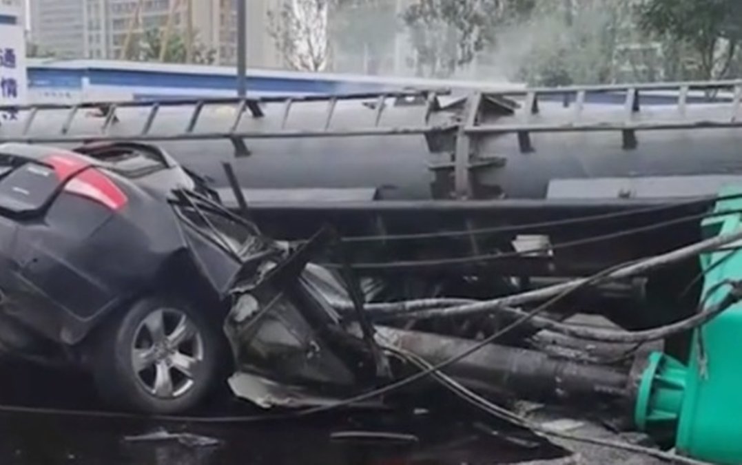 Một chiếc máy ép cọc bê tông khổng lồ bất ngờ đổ sập xuống, đè trúng chiếc ô tô màu đen đang lao tới khiến nó bẹp rúm, biến dạng. Hai người trong xe ô tô, được xác định là hai cha con, đã thiệt mạng ngay tại chỗ.