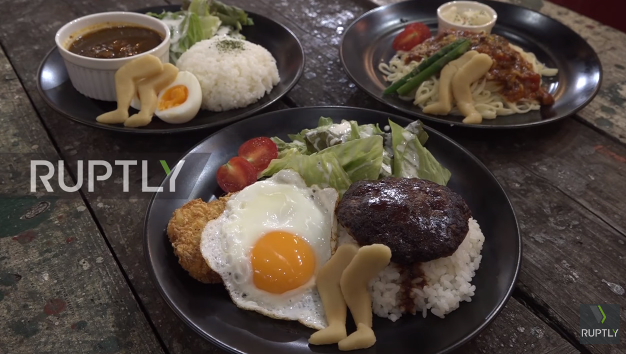 Quán cà phê không chỉ được trang trí bằng những bức ảnh cặp đùi trần mà nhiều món ăn tại đây như cà ri, spaghetti, loco moco (món ăn truyền thống ở Hawaii) còn có thêm một cặp đùi trần “dài miên man” đi kèm.