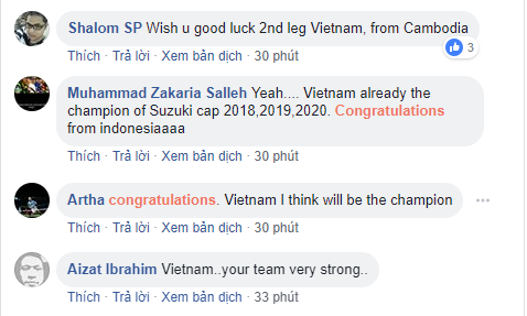 Không chỉ tại Hàn Quốc, trên trang chính thức của AFF Suzuki Cup, người hâm mộ từ nhiều quốc gia khác như Indonesia, Campuchia, Thái Lan… cũng để lại những dòng bình luận, động viên, cũng như nhắn nhủ, chúc mừng thầy trò HLV Park Hang-seo. Một số người khẳng định, kết quả trên là không quá tệ đối với ĐT Việt Nam.