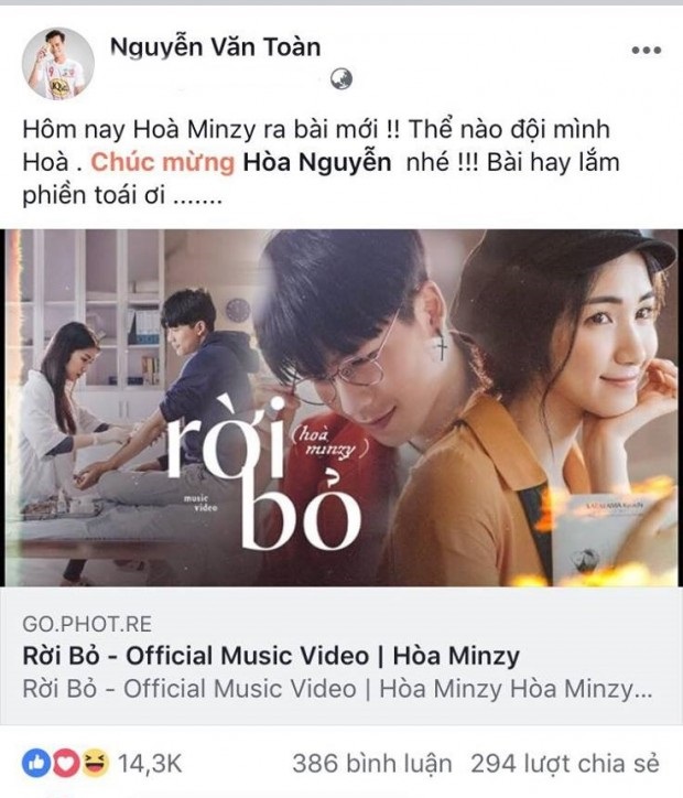 Tuy nhiên, bạn thân của Công Phượng là một câu chuyện khác. Hôm cô ca sỹ Bắc Ninh ra bài hát mới đã được Văn Toàn gửi đến một lời động viên cực kỳ dễ thương trên facebook rằng: “Hôm nay Hòa Minzy ra bài hát mới! Thể nào đội mình hòa. Chúc mừng Hòa Nguyễn nhé (nick name trên facebook của Hòa Minzy). Bài hát hay lắm phiền toái ơi…”.