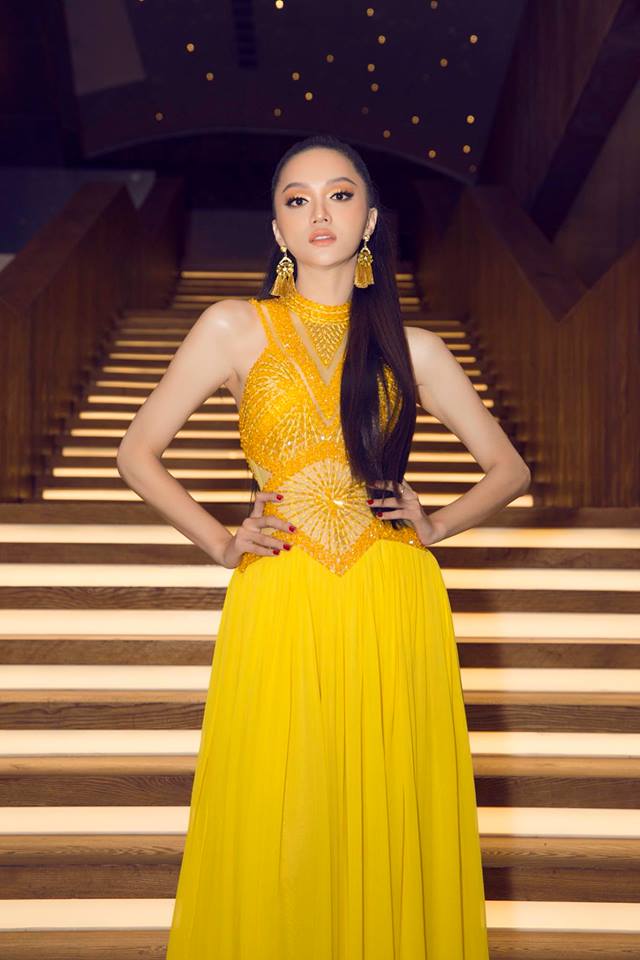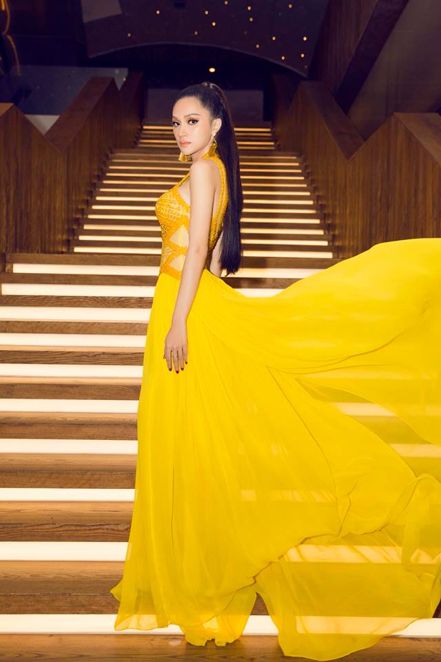 8. Trong đêm thi bán kết “Miss Tiffany Universe 2018” diễn ra tại Thái Lan, hoa hậu Chuyển giới Quốc tế 2018 Hương Giang cũng góp mặt với vai trò giám khảo, Hương Giang chọn một chiếc váy màu vàng xẻ cao với những đường cắt táo bạo, khoe được nhan sắc lộng lẫy, hình thể quyến rũ của mình.