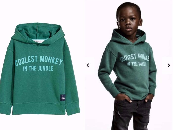 1. Vào tháng 1 năm 2018, H&M đã phải xin lỗi vì đã sử dụng một đứa trẻ da đen mặc chiếc áo in chữ ‘Coolest Monkey in the Jungle’ (con khỉ ngầu nhất trong rừng), còn đứa trẻ da trắng mặc áo ‘Survival Expert’ (chuyên gia sinh tồn). Cơn sóng tẩy chay H&M nổi lên rầm rộ vì khách hàng cho rằng đây là cách ứng xử phân biệt chủng tộc.
