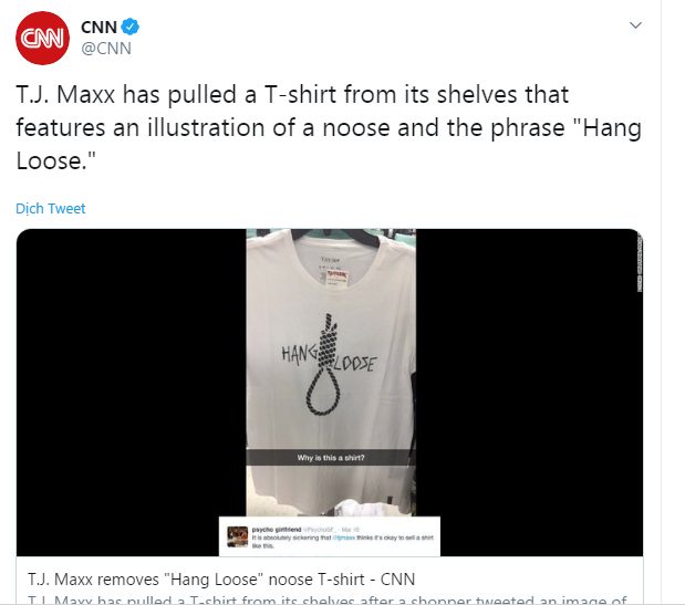7. Sự giận dữ nổ ra khắp nơi khi chiếc áo có hình thòng lọng được kẹp giữa dòng chữ ‘Hang Loose’ (treo lủng lẳng, phó mặc) được phát hiện trong cửa hàng T.J. Maxx. Đáp lại phản ứng dữ dội, người phát ngôn của T.J. Maxx đã lên tiếng xin lỗi và giải thích đây là sai sót trong khâu duyệt mẫu thiết kế.