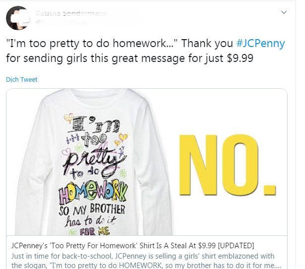 5. Slogan ‘Too Pretty to Do Homework’ (Quá xinh đẹp để phải làm bài tập về nhà) của JCPenney đã bị lên án mạnh mẽ bởi ẩn chứa thông điệp phân biệt giới tính. Đồng thời nhiều bậc phụ huynh cũng không hài lòng khi biết con gái họ có nguy cơ mang tư tưởng lệch lạc vì các loại slogan vô bổ này.