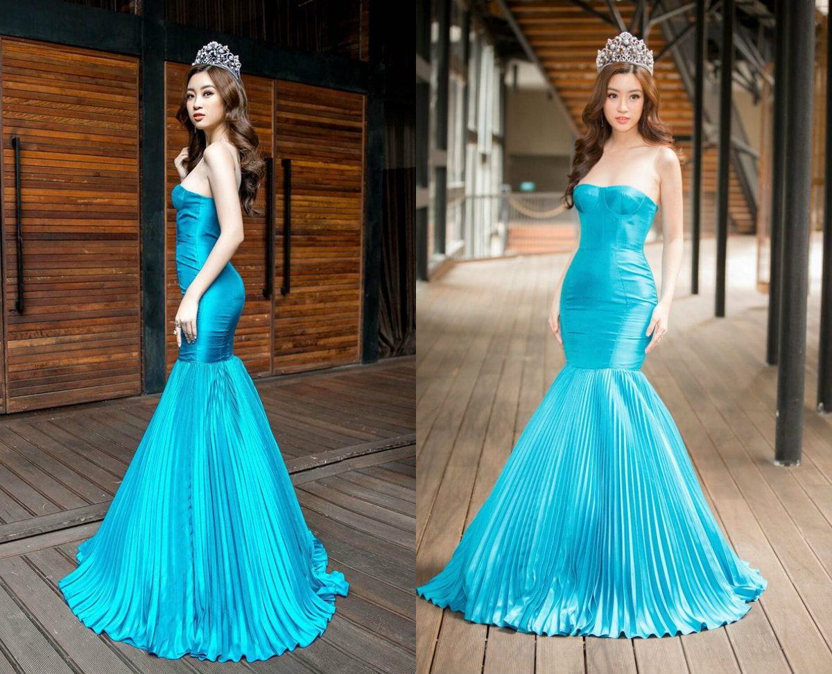 Tại một sự kiện khác, hoa hậu gây ấn tượng bằng cách “chơi trội” khi mặc chiếc đầm màu xanh biển nổi bật với kiểu dáng cúp ngực cùng phần dập ly cầu kì ở đuôi váy vô cùng lộng lẫy.