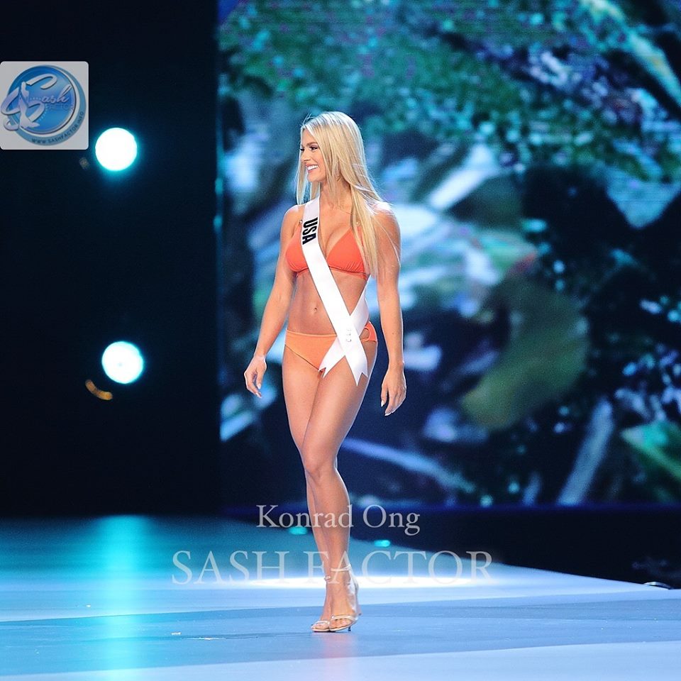 Trong ảnh là phần dự thi của thí sinh đến từ Mỹ. Đây là người đẹp có chiều cao khiêm tốn nhất cuộc thi 1m68. Song cô ghi điểm với 3 vòng săn chắc, nụ cười ngọt ngào.