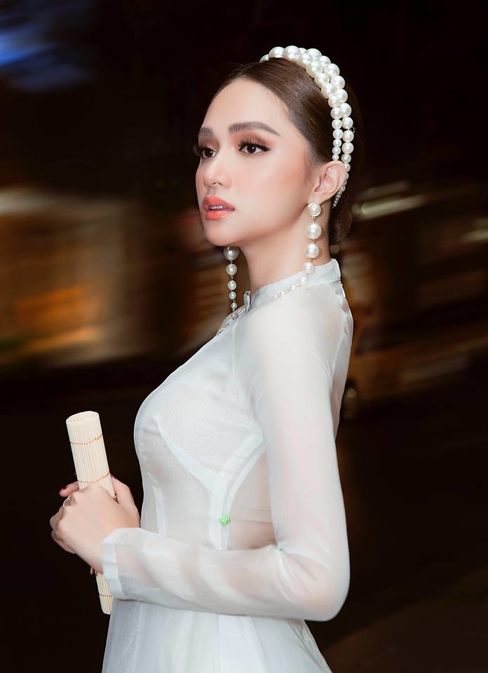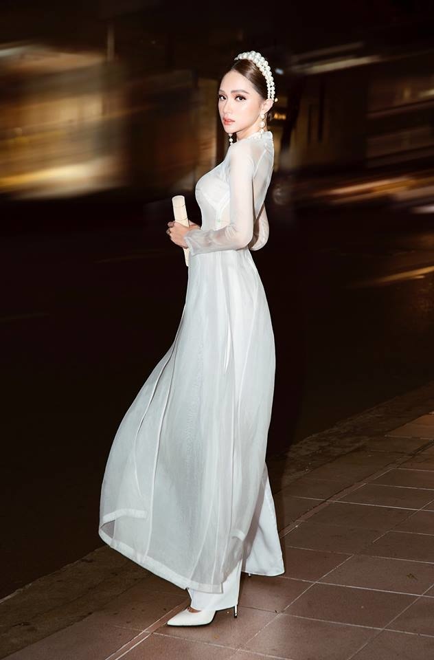 Lần xuất hiện hiếm hoi trong tà áo dài, nữ ca sĩ “Em đã thấy anh cùng người ấy” mang lãi vẻ ngoài đẹp mong manh. Mái tóc cô được trang trí những hạt ngọc trai cùng chiếc ví cầm tay bằng tre khiến cô thu hút tuyệt đối mọi ánh nhìn. Tuy nhiên, điều khiến tất cả mọi người trầm trồ nhất chính là vòng 1 căng tràn đầy đằng sau lớp áo trắng của Hương Giang khi diện áo dài trắng.