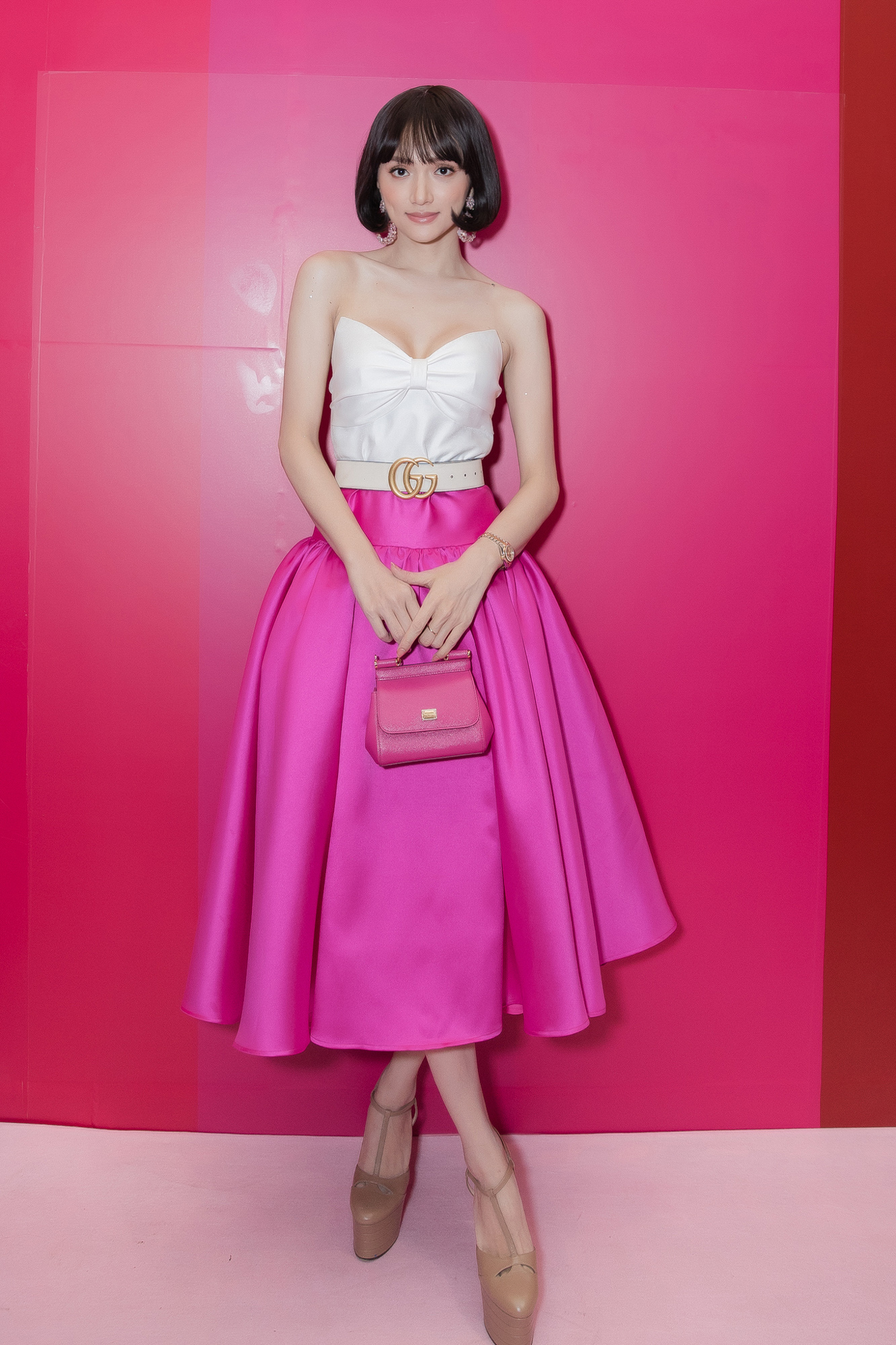 Tham gia một sự kiện do Hương Giang góp vốn, Hương Giang diện đồ cực kì nữ tính với váy hồng và áo cúp ngực màu trắng. Outfit này khiến cho nàng hậu trông vừa quyến rũ nhưng không kém phần năng động và tươi sáng.