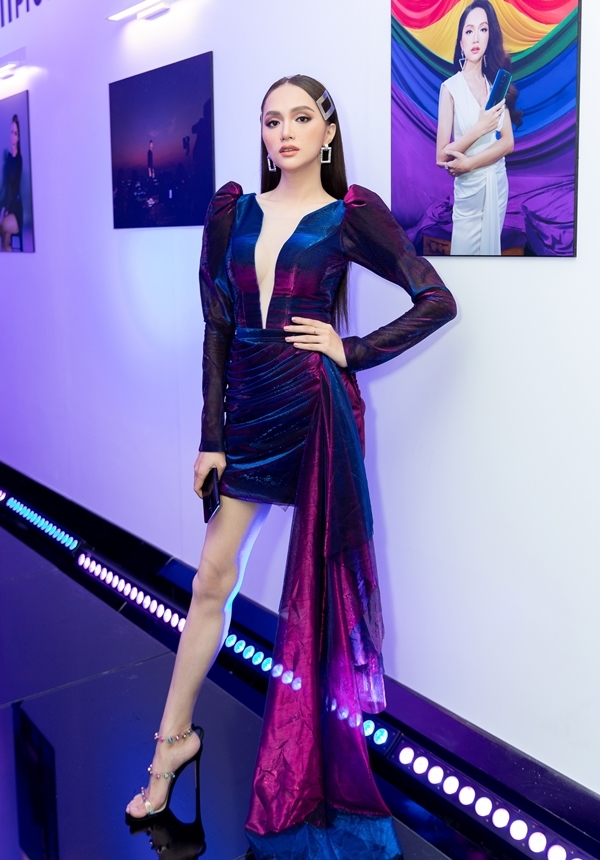 Hương Giang tôn dáng với váy xẻ ngực sâu xuyên thấu, thiết kế phá cách với phần đuôi dài bên hông. Ca sĩ chuộng trang phục ánh tím vì toát lên vẻ sang trọng, quyến rũ.