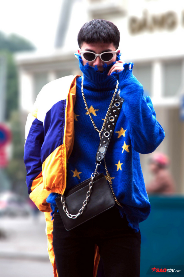 Cũng là set trang phục với sắc xanh - vàng chủ đạo, bạn trẻ này chọn cho mình chiếc mắt kính viền to nổi bật phối cùng. Đặc biệt, với chiếc áo len tua rua ở cổ họa tiết ngôi sao vừa sành điệu lại vừa có thể thay thế khăn len che kín cổ và mặt như thế này cực ấm áp mà vẫn rất thời trang.