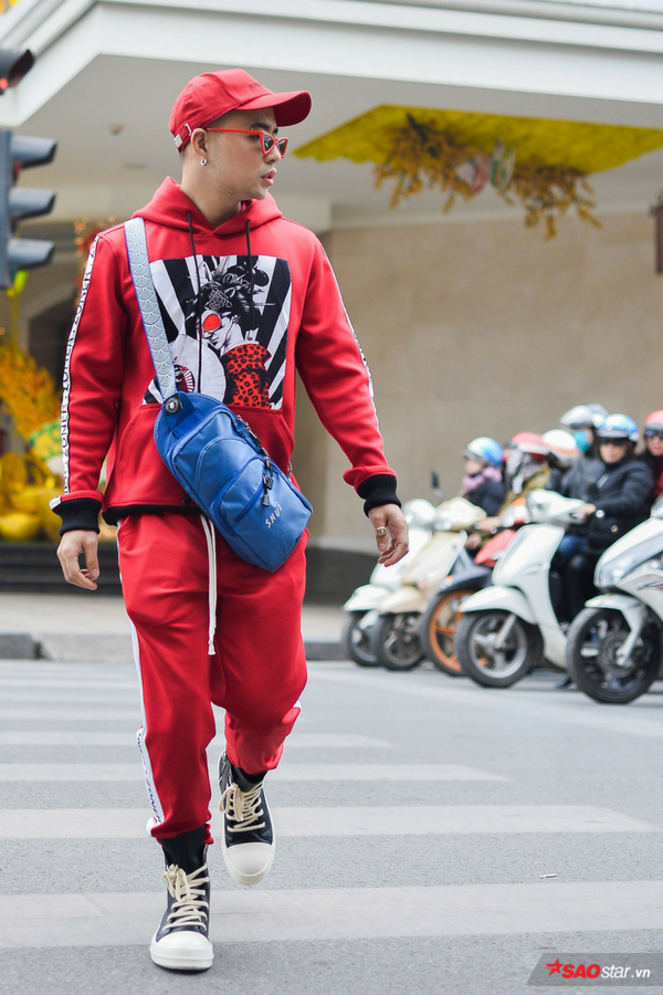 Tông đỏ vốn là sắc màu chủ đạo của mùa Xuân đồng thời cũng là gam màu nóng tăng sự ấm áp cho người mặc. Trang phục được hoàn thiện bằng túi đeo chéo nhiều ngăn cùng mũ lưỡi trai và kính mắt mèo viền đỏ rực cực chất.