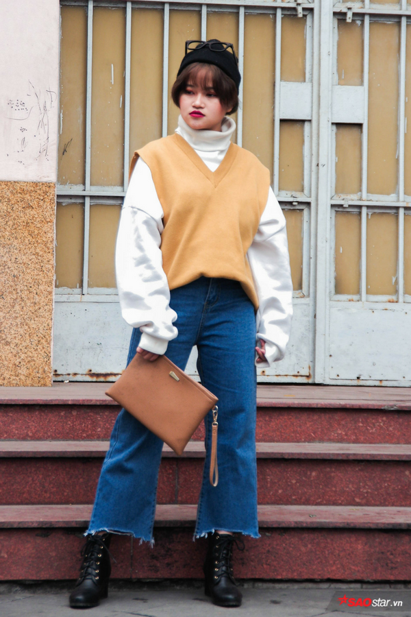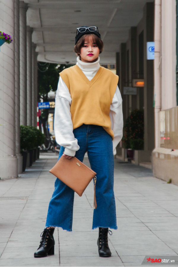 Áo cao cổ, áo len khoác ngoài phối với quần jean ống rộng cùng giày da, đây có lẽ là set đồ đơn giản mà không thể thiếu trong tủ đồ của các tín đồ thời trang trong những ngày tiết trời khá lạnh của Hà Nội dịp cuối năm.