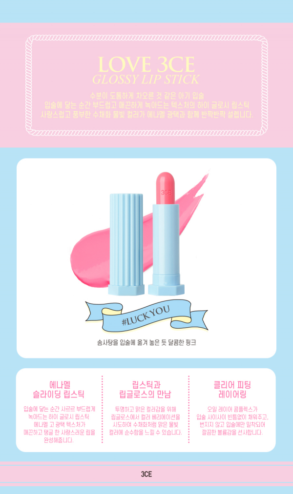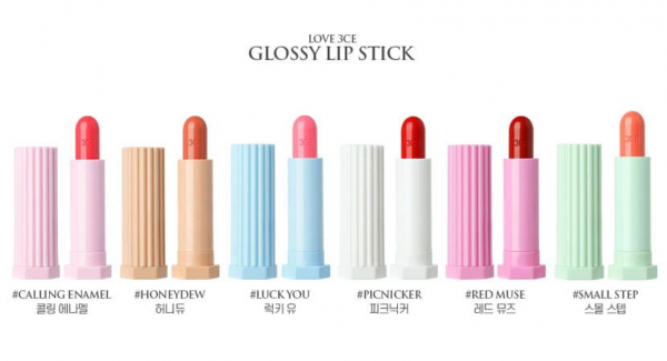 Bảng màu son Glossy trong BST LOVE 3CE khá đa dạng với những gam màu nổi bật từ thương hiệu 3CE.