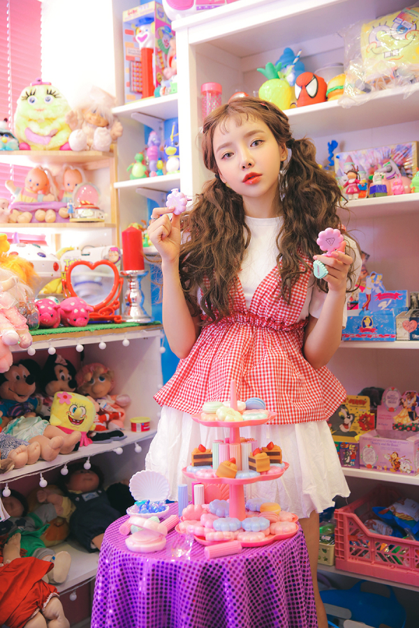 Bối cảnh trong BST được trang trí theo motif cửa hàng đồ chơi, thấp thoáng đâu đó chiếc khay bánh mỹ phẩm xinh xắn và lung linh.