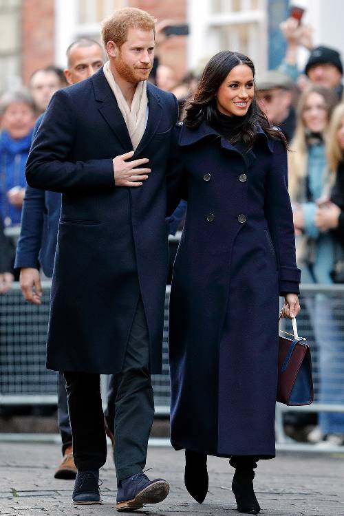 Phối hợp ăn ý với hoàng tử Harry, Meghan Markle diện áo choàng dài màu xanh thẫm, kết hợp với boot đen thanh lịch.
