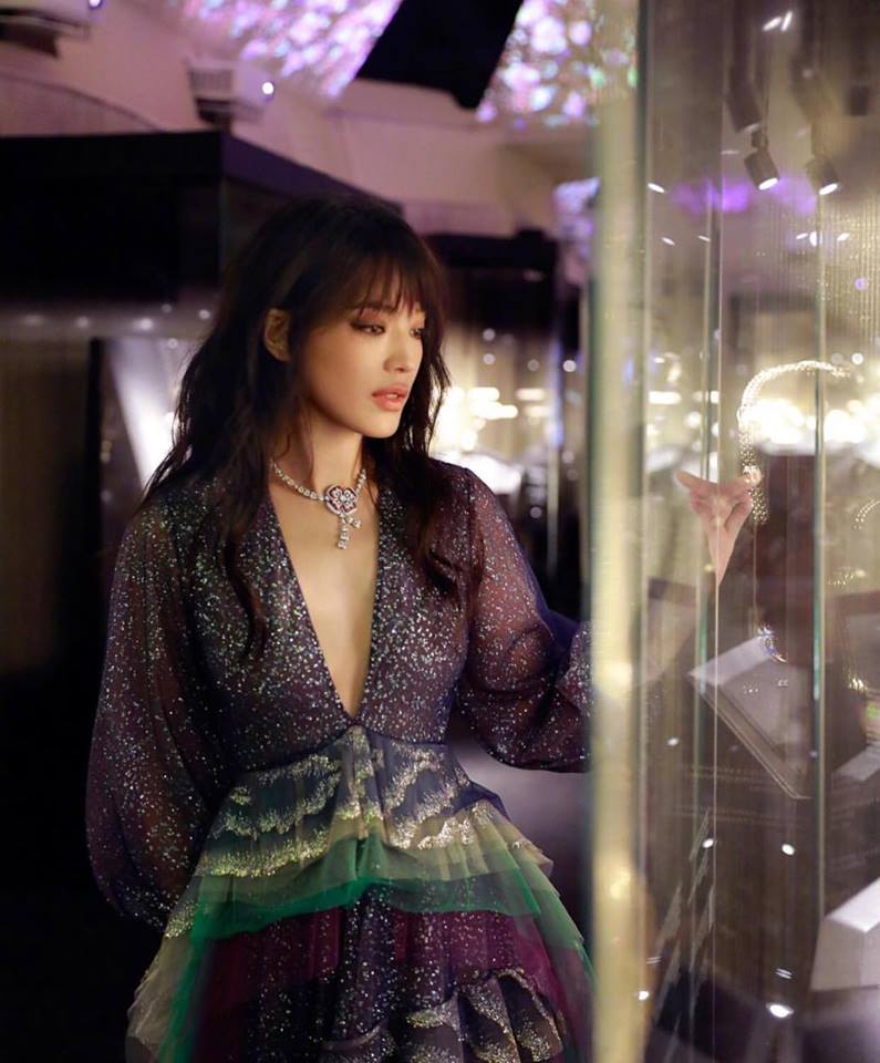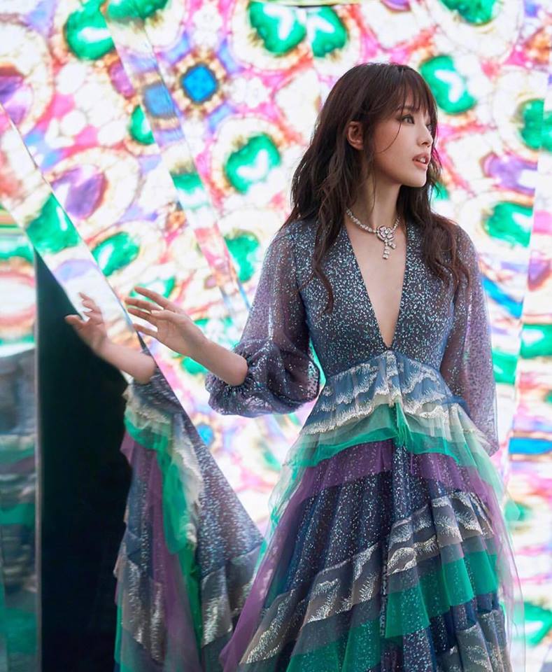 Sau đó, Thư Kỳ lại thay cho mình một diện mạo khác với kiểu tóc mái ngang xõa dài, chiếc đầm xẻ chữ V với gam màu ngũ sắc lấp lánh