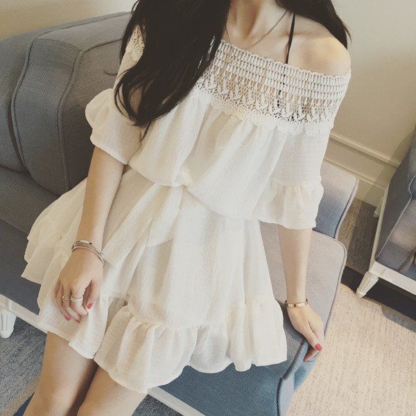 Váy trễ vai có chi tiết ren và bèo nhún thế này chắc các nàng dịu dàng, “bánh bèo” thích lắm đây. Màu trắng, màu be, màu hồng vỏ đỗ hay màu đen là những màu hợp với kiểu váy này hơn cả.