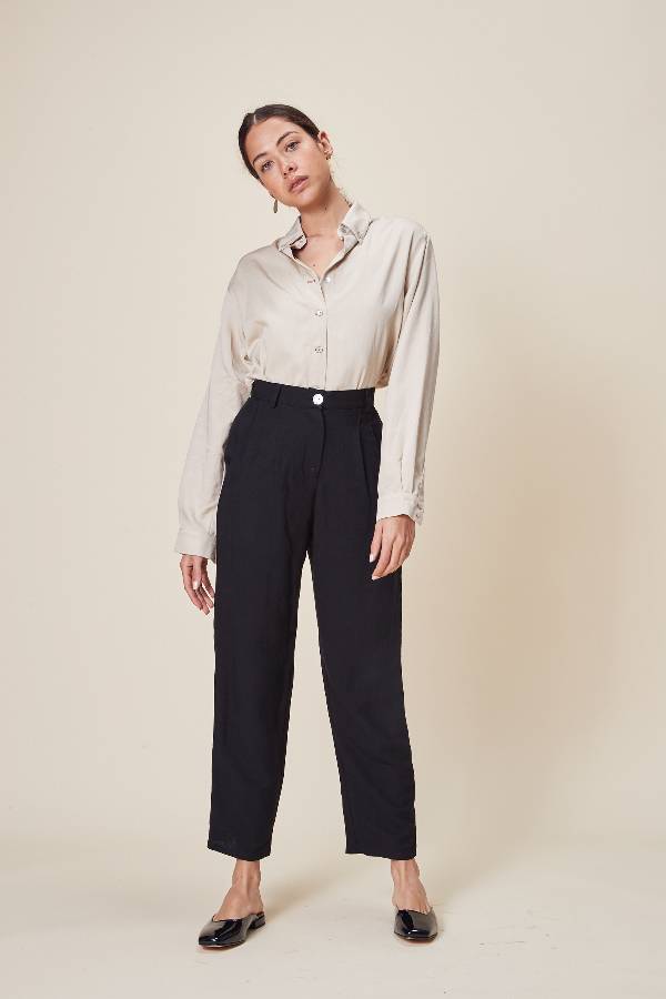 Quần ống rộng đang là mốt, vậy còn gì thích hợp hơn set đồ với áo sơ mi lụa hồng đóng thùng cùng quần kaki phom rộng này.