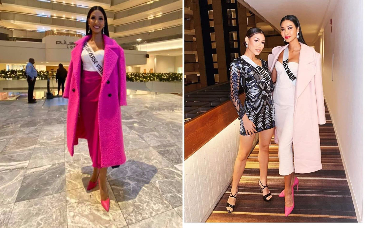 Tuy mang số lượng hành lý khủng, nhưng Hoàng Thùy vẫn sử dụng một phụ kiện những hai ba lần. Đôi giày cao gót màu hồng này là một ví dụ. Ngoài ra chiếc áo măng tô hồng cánh sen cũng được khoác đi khoác lại khi tham gia các hoạt động bên lề.
