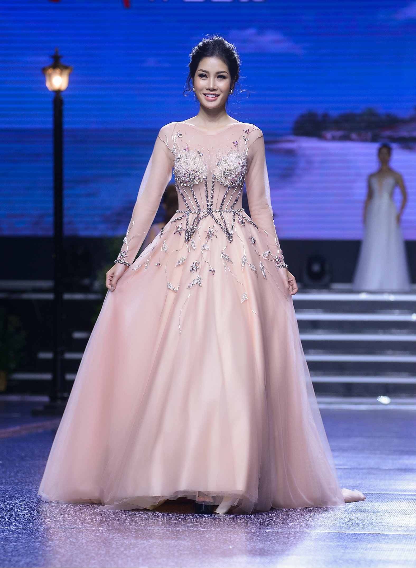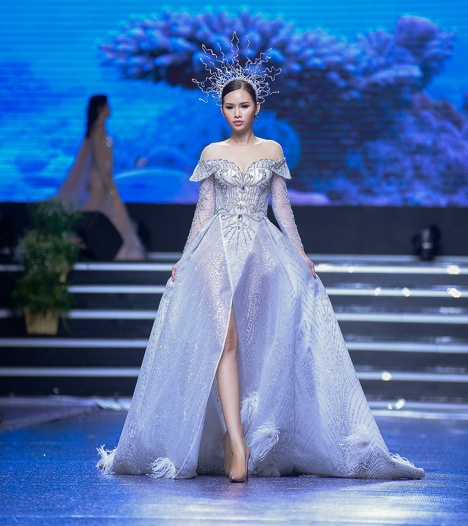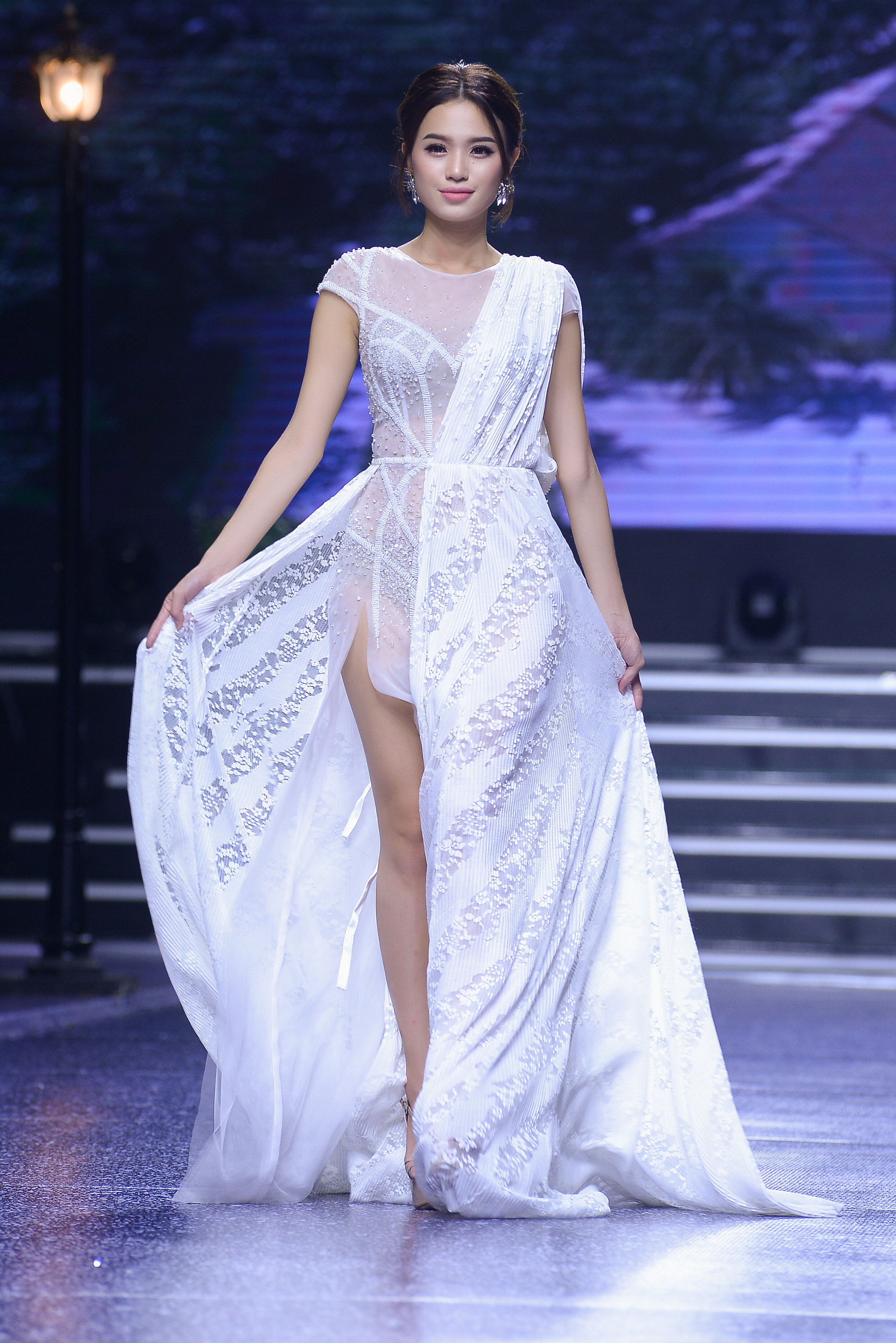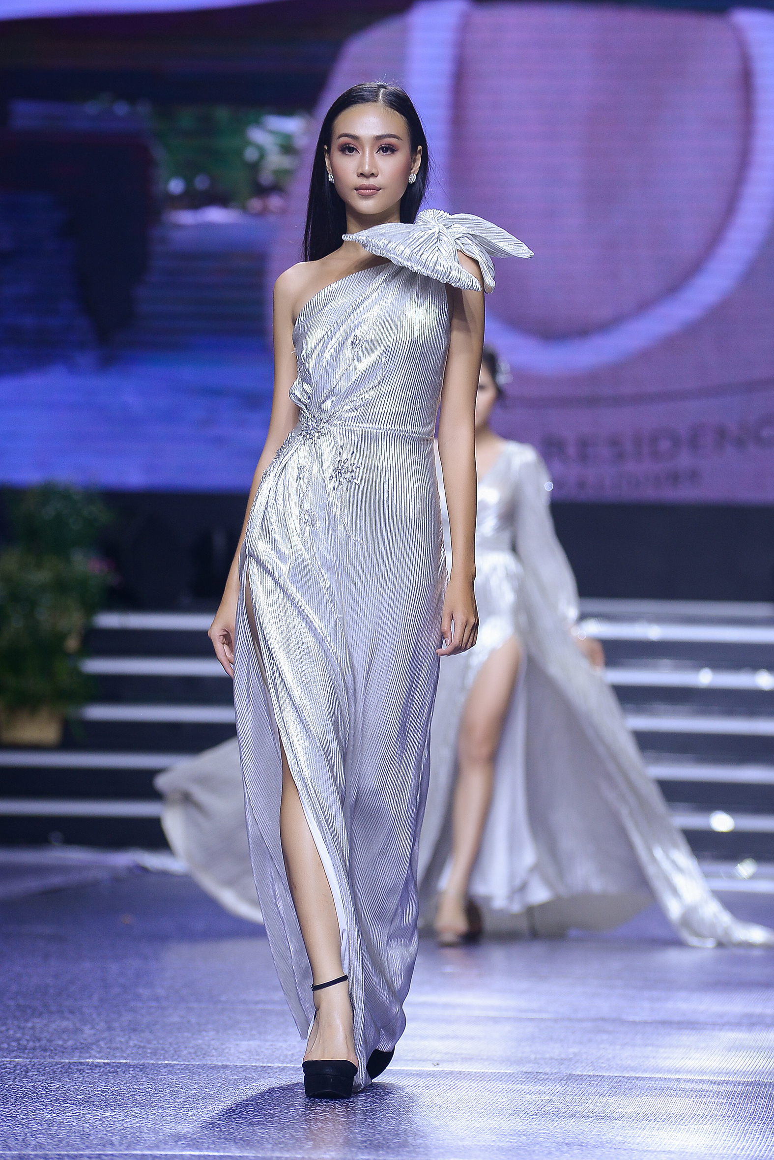 Á hậu có vòng ba 1 mét tự tin sải bước chuyên nghiệp thể hiện đúng thông điệp của bộ sưu tập thời trang lần này.