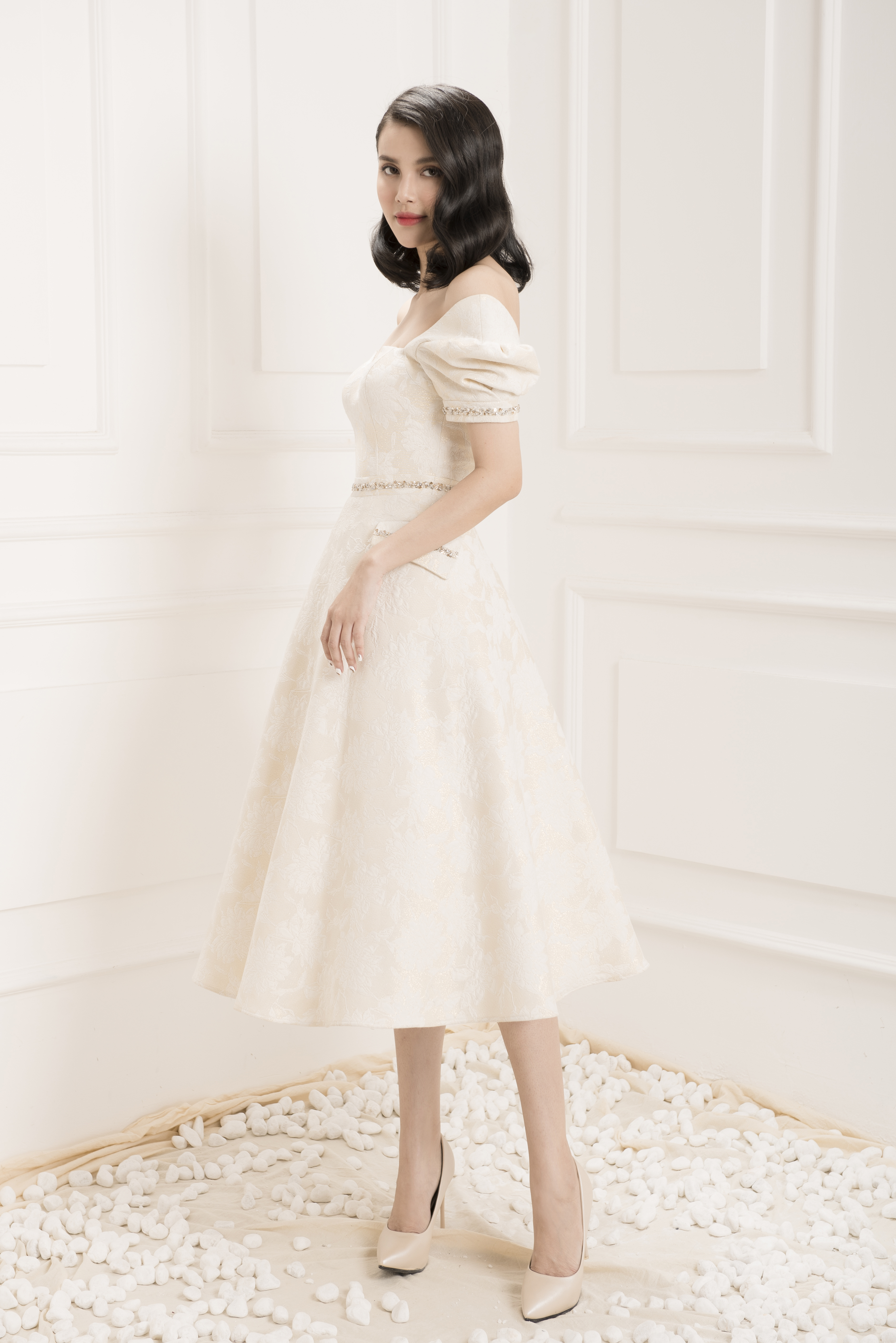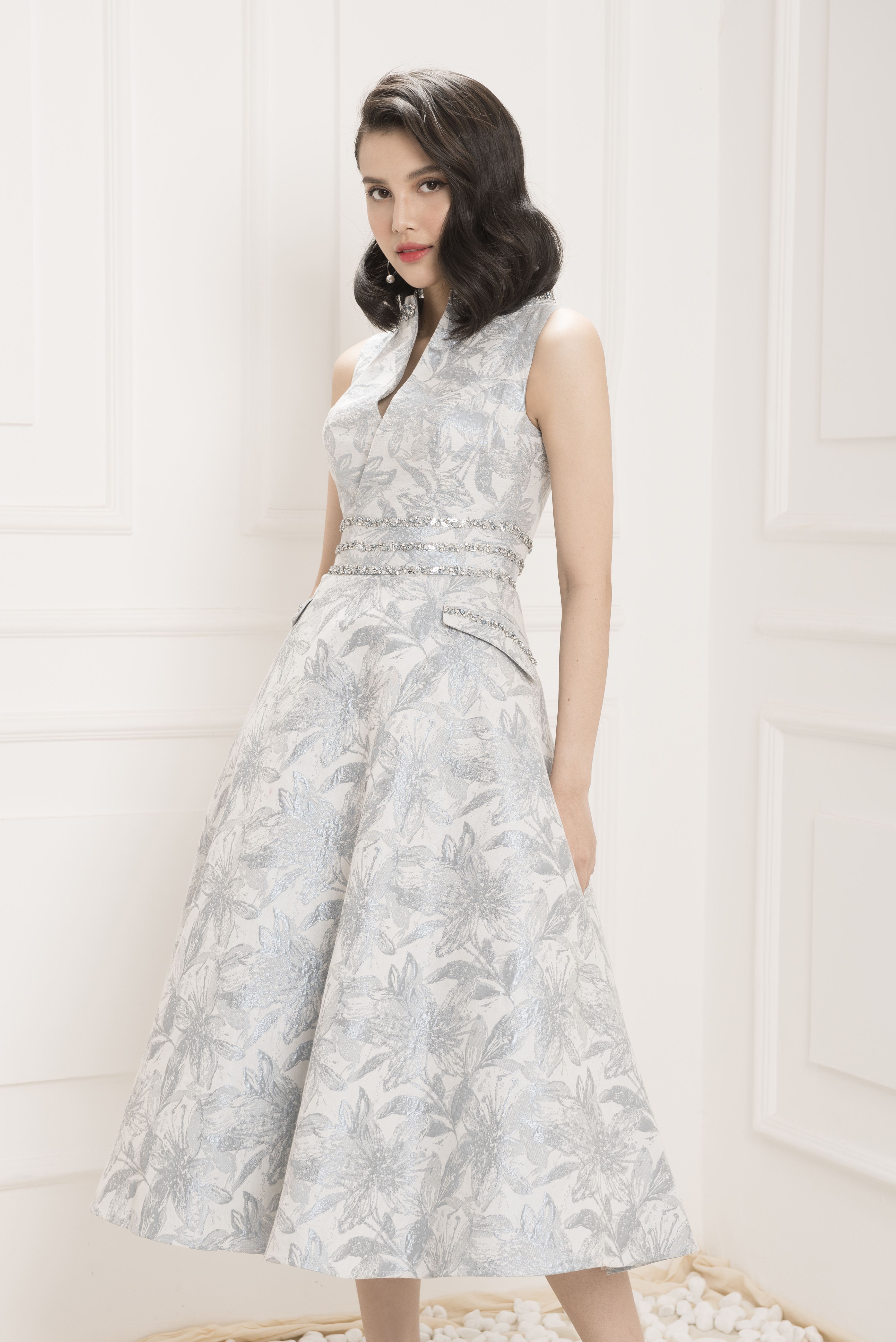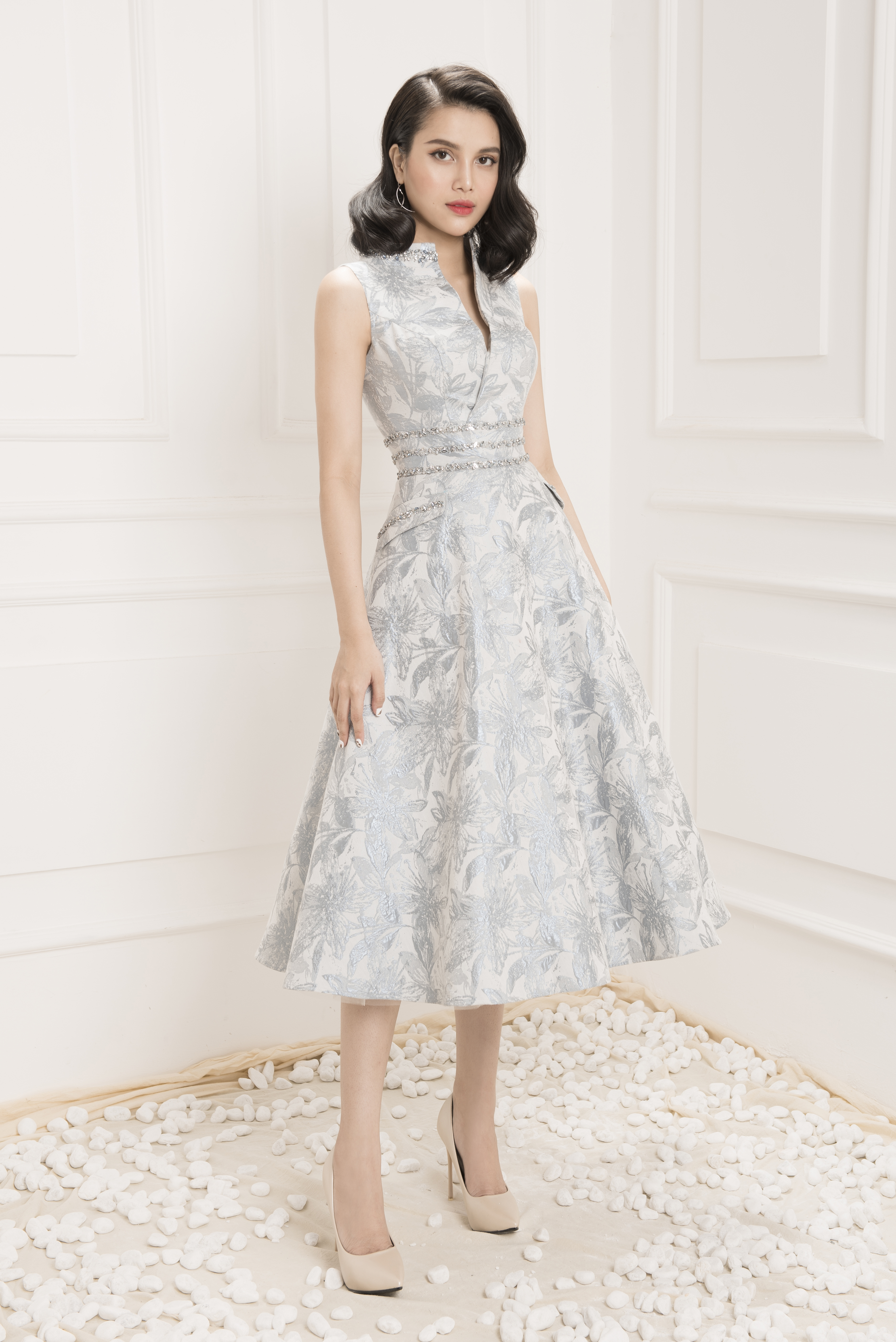 Không chỉ mang vẻ đẹp ngọt ngào, Diệu Thùy còn chinh phục mọi ánh nhìn với những mẫu váy xòe midi cổ điển kết hợp cùng những chi tiết thiết kế hiện đại càng tôn lên sự sang trọng và quý phái cho người đẹp.