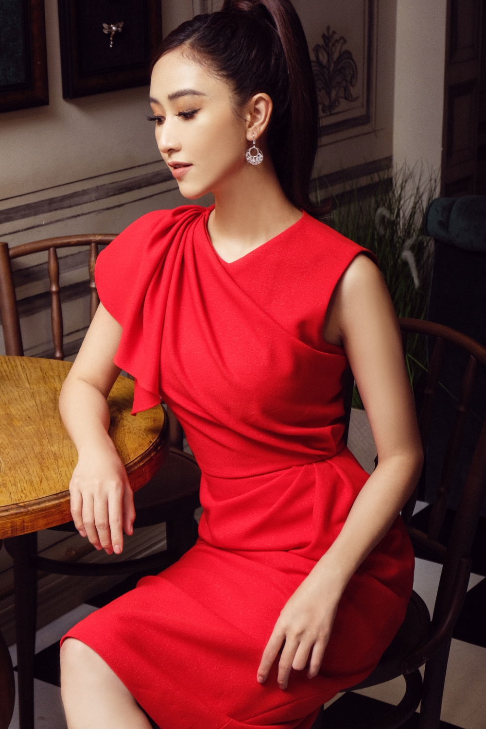 Nắm bắt lợi thế vòng eo thon gọn của Hà Thu, nhà thiết kế khéo léo áp dụng chi tiết thắt nơ ở eo để người đẹp sinh năm 1992 khoe dáng.
