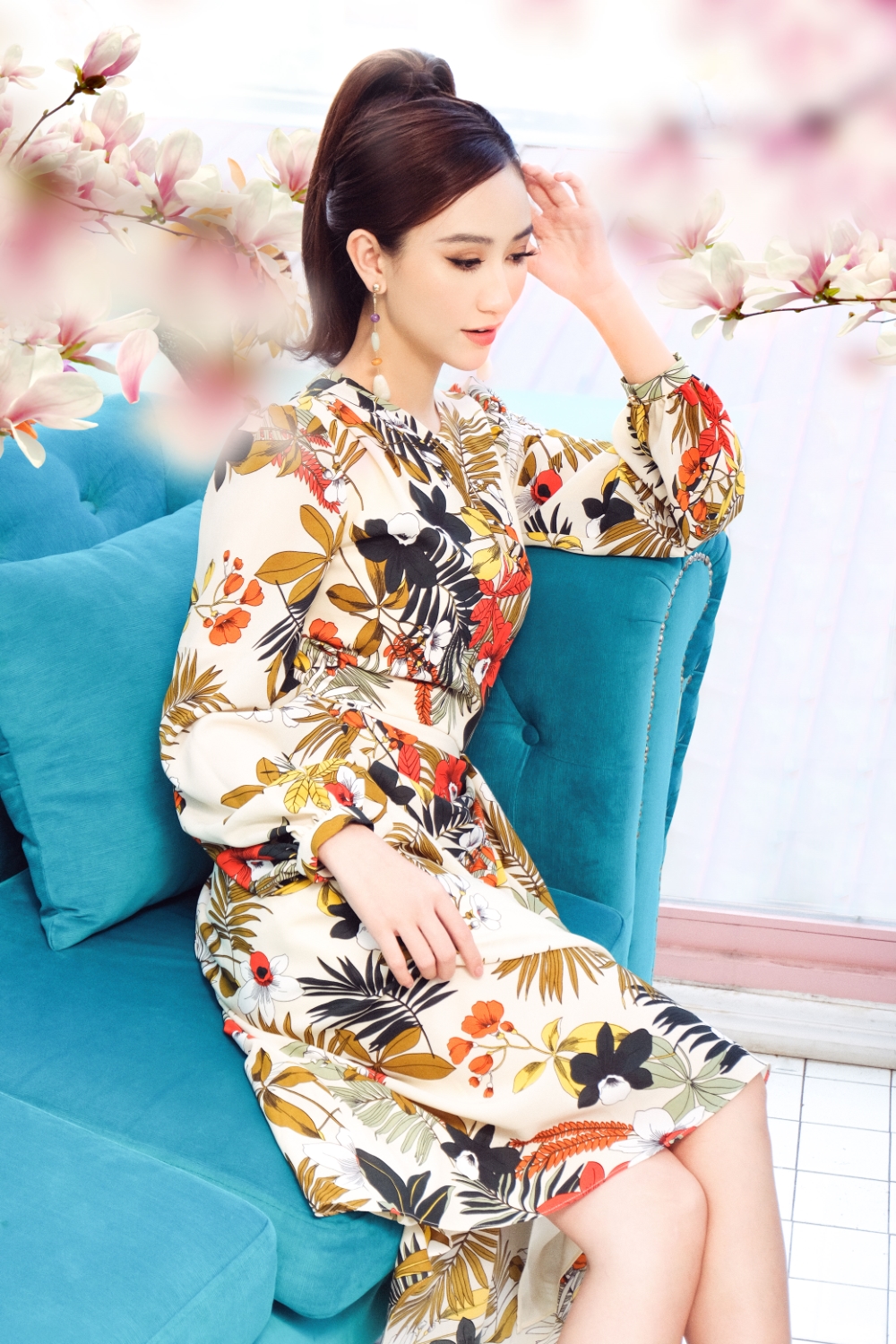 Những chiếc váy xòe họa tiết hoa cũng là điểm nhấn trong bộ sưu tập lần này. Chi tiết cổ tròn kín đáo, kết hợp cùng việc lựa chọn những họa tiết đơn giản giúp người mặc trẻ trung, thoải mái khi di chuyển, làm việc. Trong một số bộ trang phục, NTK còn tận dụng kỹ thuật gấp nếp, kiểu dáng phồng tay.