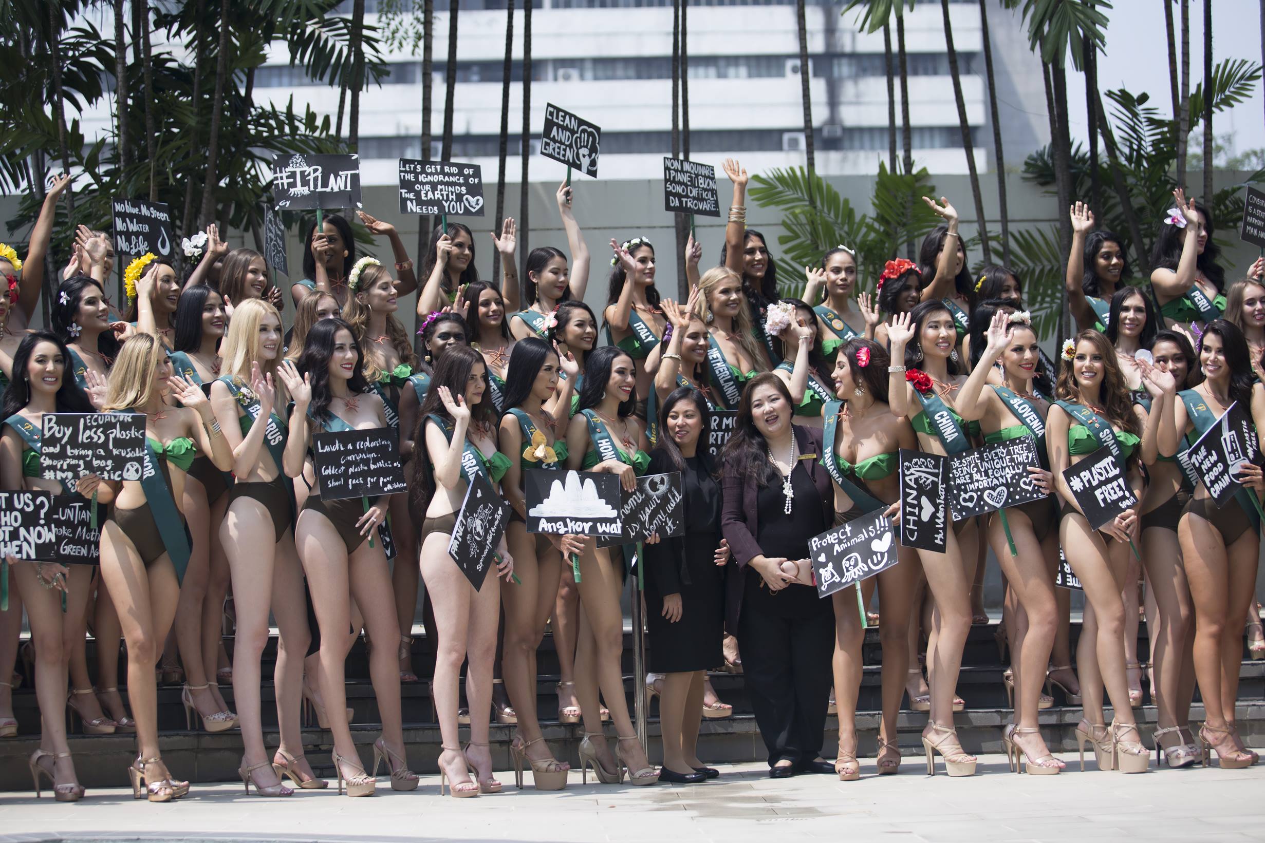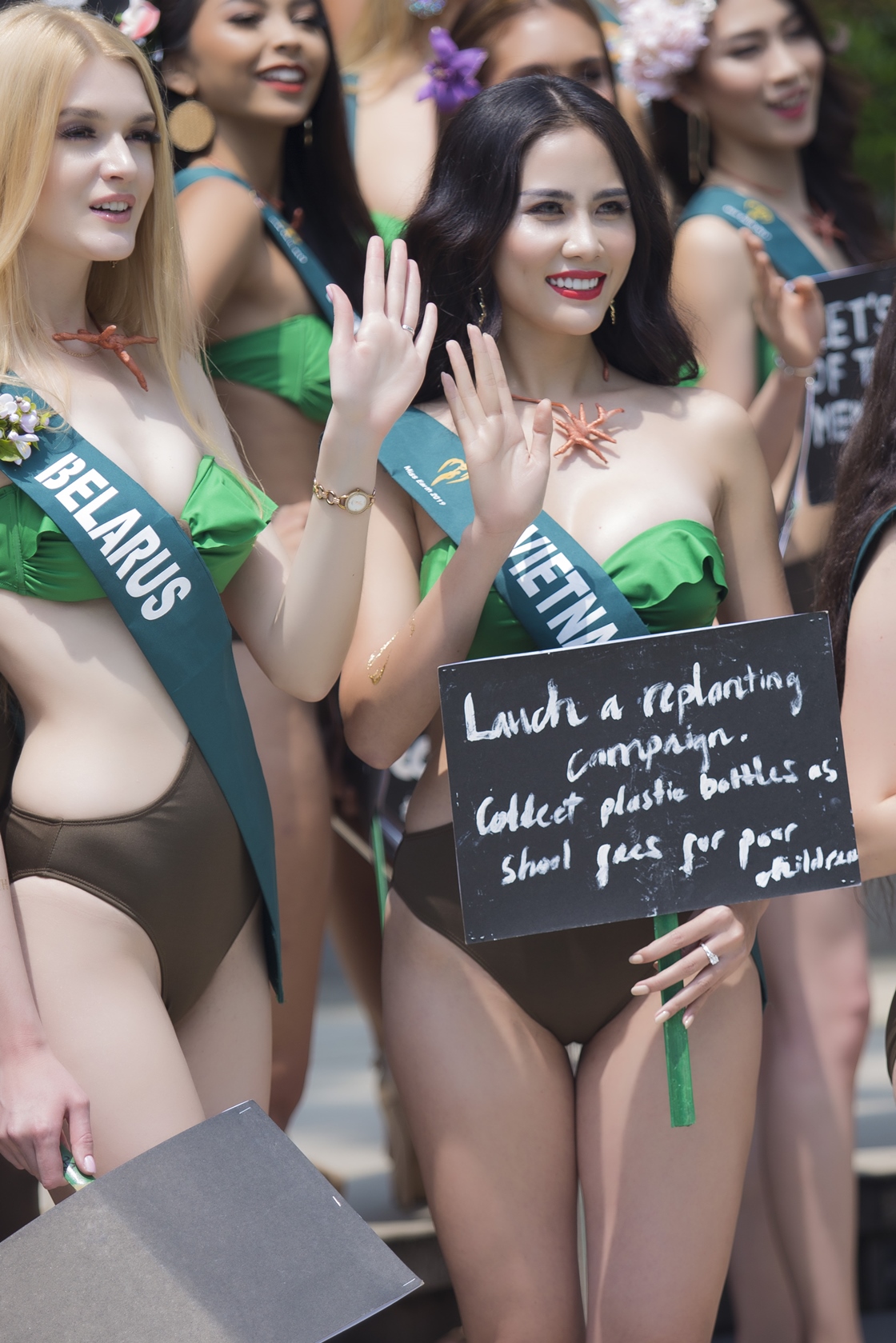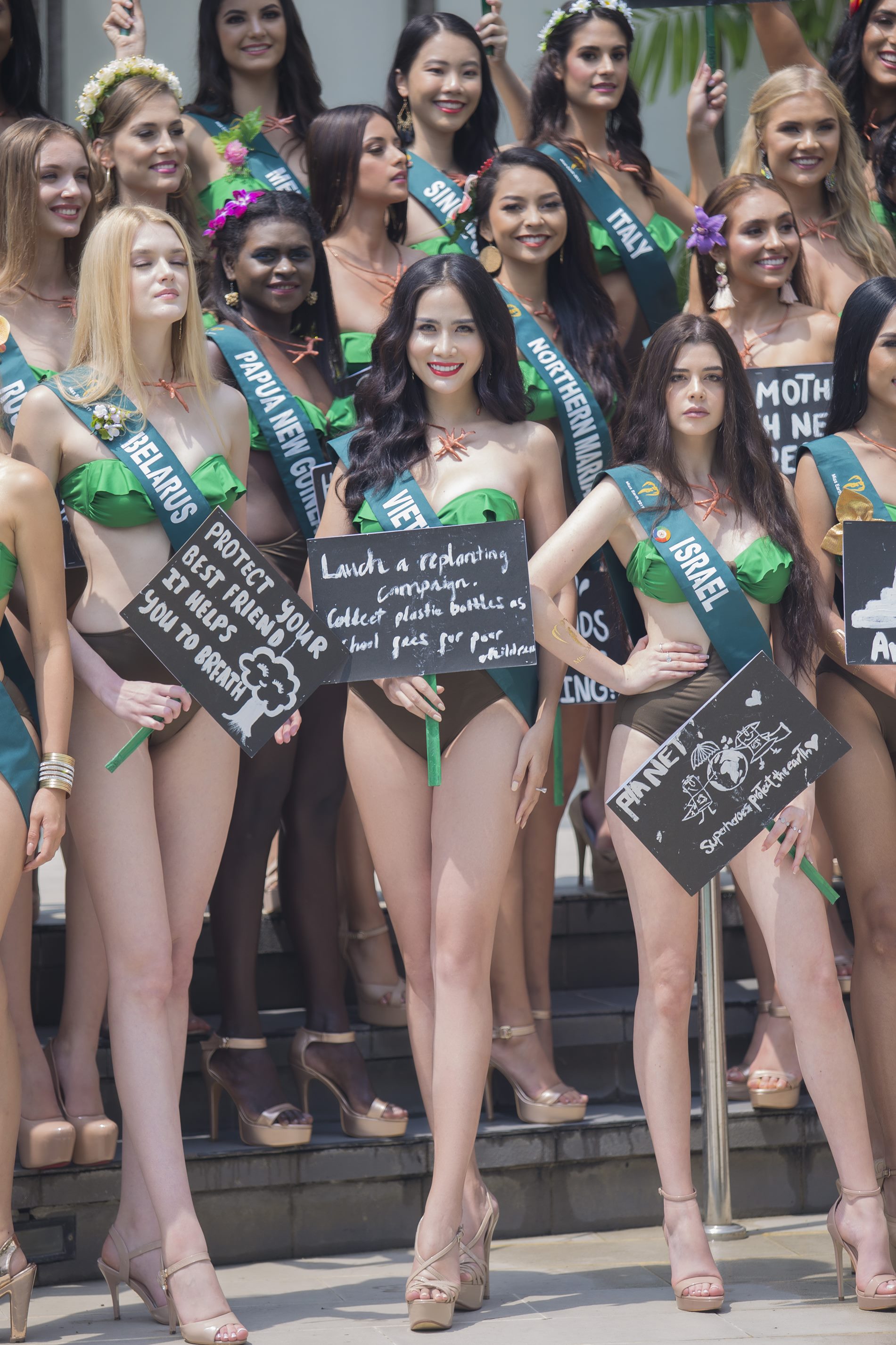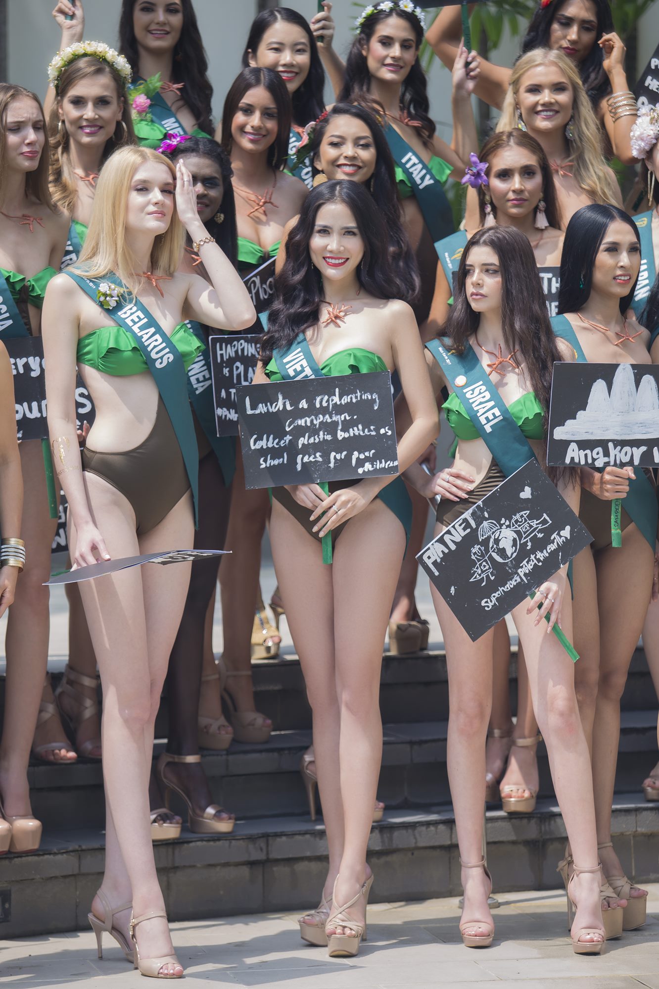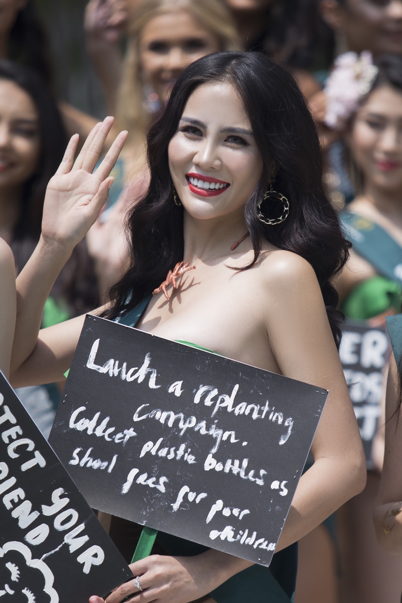Tại một hoạt động bên lề Miss Earth năm nay, Hoàng Hạnh cùng các thí sinh đã có màn diện trang phục bikini màu xanh đặc trưng của trái đất tại hồ bơi. Đại diện Việt Nam nhanh chóng ghi điểm với chiều cao 1m76, số đo 89-63-95 cm.