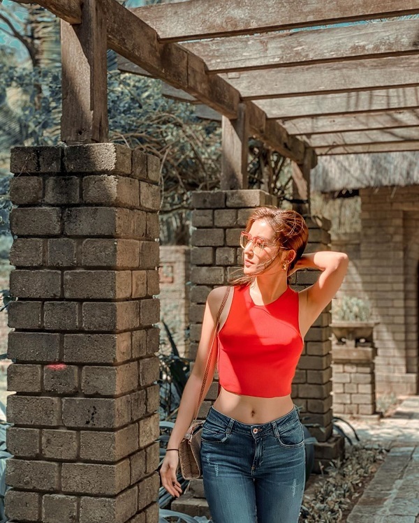 Ngoài ra, Huyền My chọn trang phục đi biển vô cùng trẻ trung , năng động với áo croptop đỏ khoe eo con kiến cùng băng đô xuyệt tông